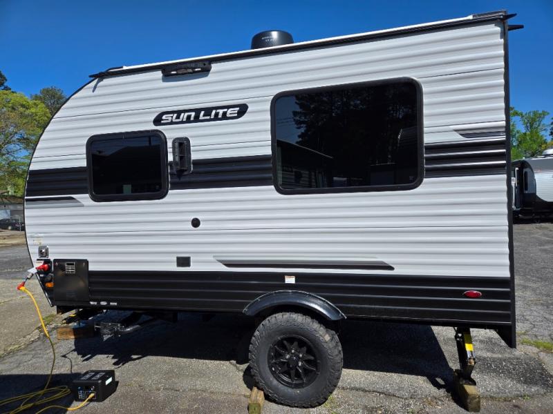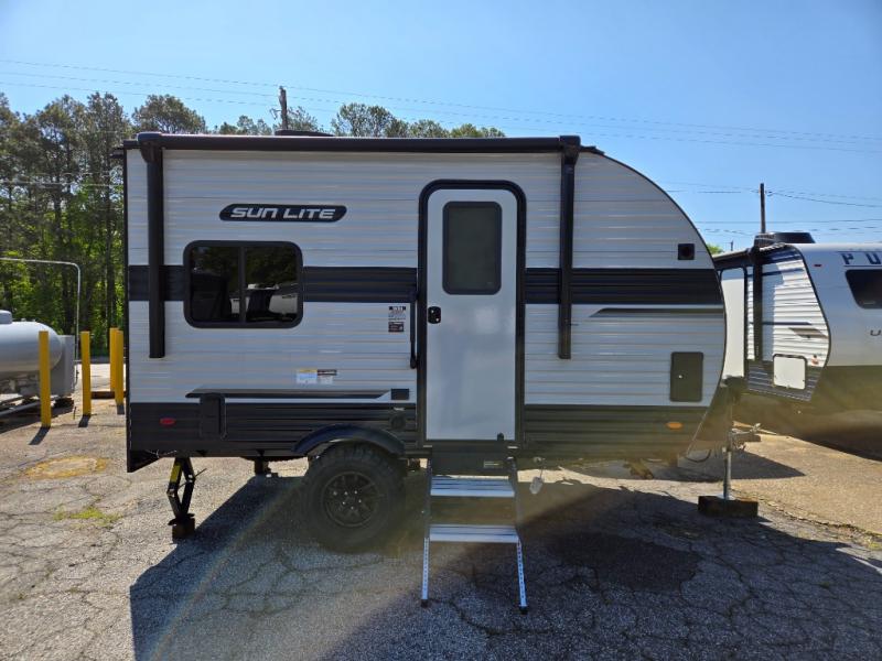 You can trust the build and enjoy your experience with any one of these Sunset Park RV Sun Lite travel trailers or toy haulers! Their aerodynamic profile is not only easy to haul, but also saves on fuel. They are built to withstand years of traveling even though they are lightweight with a diamond plate rock guard, a one piece PVC roof membrane, Dexter Spring-Leaf axles, and tinted safety glass windows. Some comfort standards you are sure to enjoy are the two-burner stove top range with hood, light and fan, plus the refrigerator and microwave, and an outside shower to help keep the dirt outdoors where it belongs.
