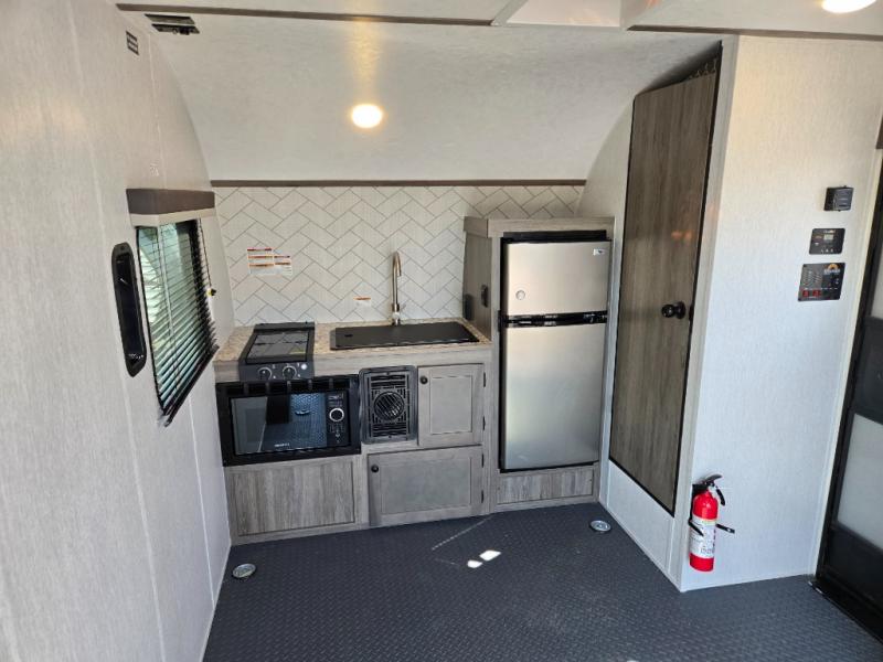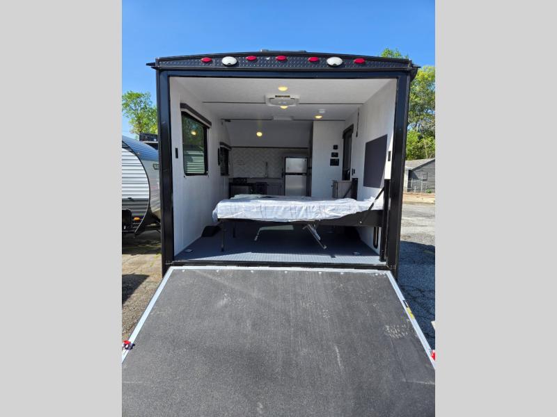 Get ready for a great camping experience where you can take along your favorite ride-on toys, kayaks, or other items that you may not normally have room to load as this toy hauler features a 6' 9" cargo width and 10' 11" cargo length. Once unloaded, set up with the rear bed that will make for a great night's rest. The front of this unit is shared with the wet bath and kitchen. Here, you can make meals on the two burner stove or in the microwave oven, and there is a refrigerator for perishables.