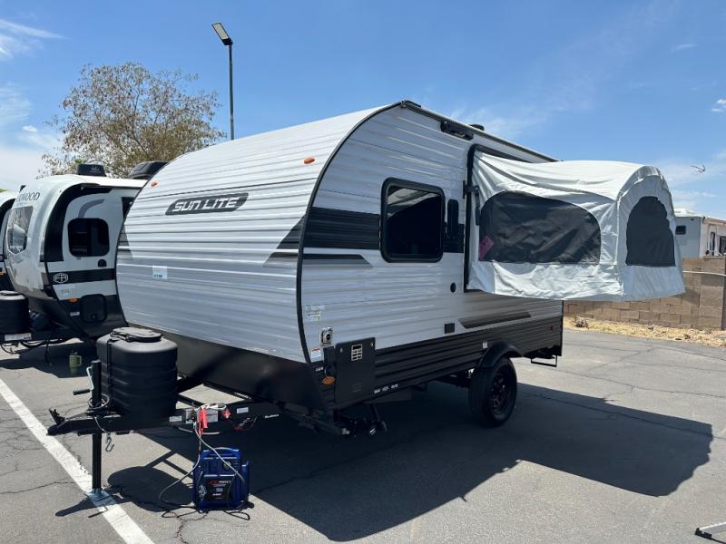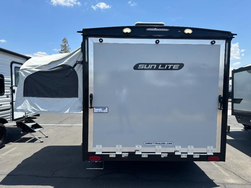 You can trust the build and enjoy your experience with any one of these Sunset Park RV Sun Lite travel trailers or toy haulers! Their aerodynamic profile is not only easy to haul, but also saves on fuel. They are built to withstand years of traveling even though they are lightweight with a diamond plate rock guard, a one piece PVC roof membrane, Dexter Spring-Leaf axles, and tinted safety glass windows. Some comfort standards you are sure to enjoy are the two-burner stove top range with hood, light and fan, plus the refrigerator and microwave, and an outside shower to help keep the dirt outdoors where it belongs.