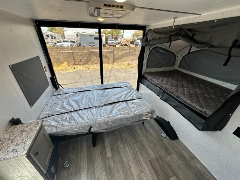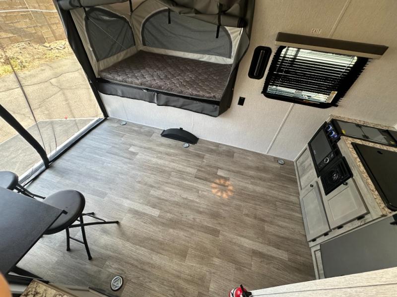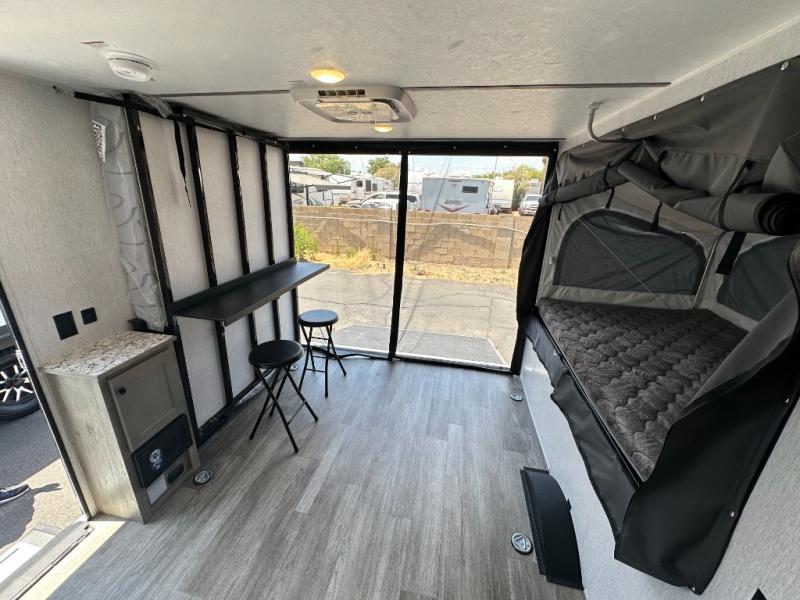 Get ready for a great camping experience where you can take along your favorite ride-on toys, kayaks, or other items that you may not normally have room to load as this toy hauler features a 6' 9" cargo width and 10' 11" cargo length. Once unloaded, set up with the rear bed that will make for a great night's rest. The front of this unit is shared with the wet bath and kitchen. Here, you can make meals on the two burner stove or in the microwave oven, and there is a refrigerator for perishables.