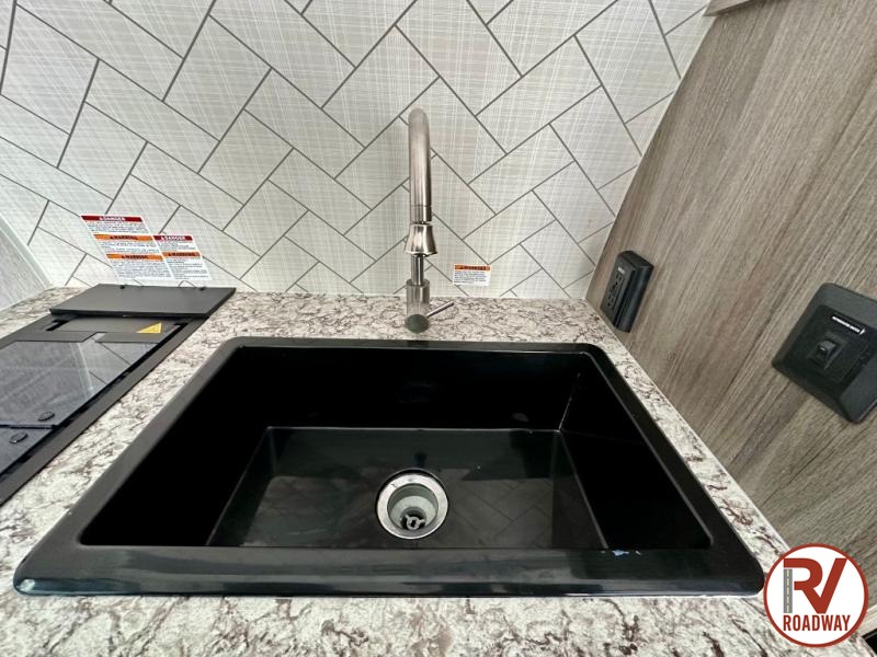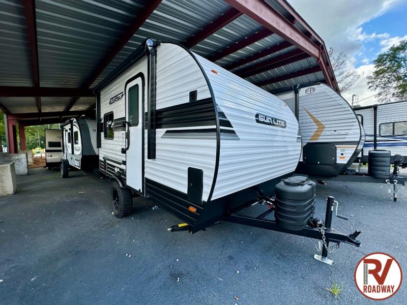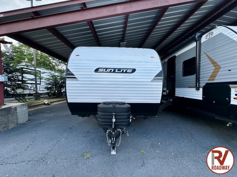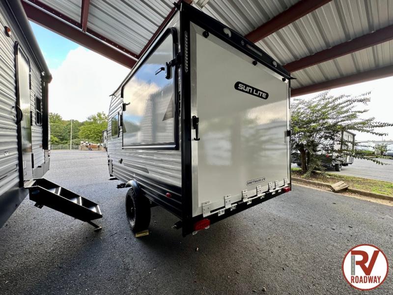 You can trust the build and enjoy your experience with any one of these Sunset Park RV Sun Lite travel trailers or toy haulers! Their aerodynamic profile is not only easy to haul, but also saves on fuel. They are built to withstand years of traveling even though they are lightweight with a diamond plate rock guard, a one piece PVC roof membrane, Dexter Spring-Leaf axles, and tinted safety glass windows. Some comfort standards you are sure to enjoy are the two-burner stove top range with hood, light and fan, plus the refrigerator and microwave, and an outside shower to help keep the dirt outdoors where it belongs.