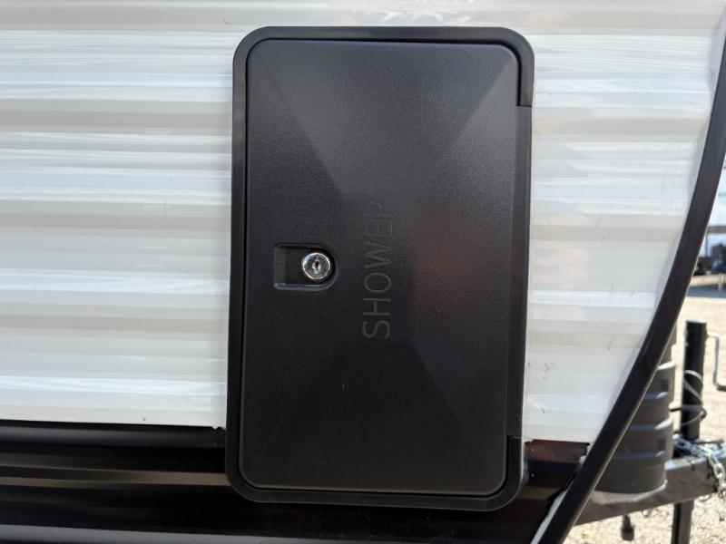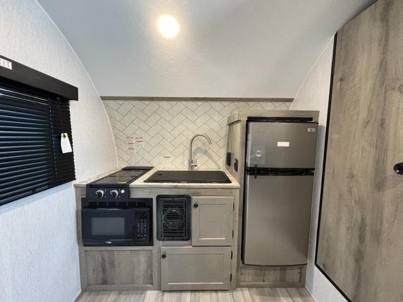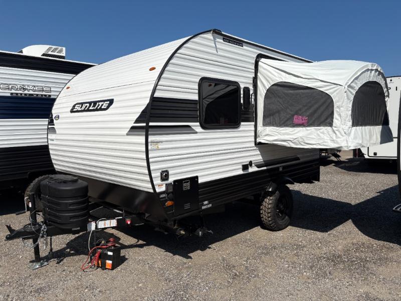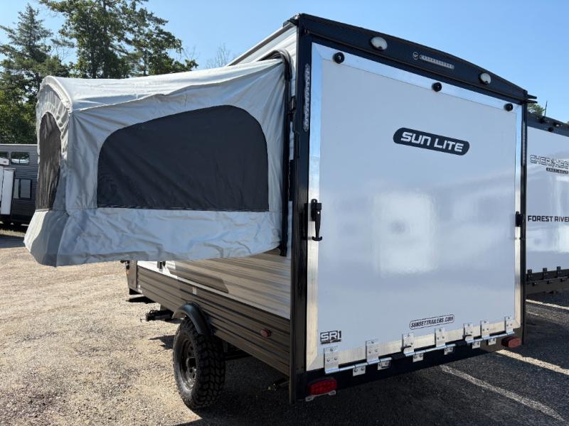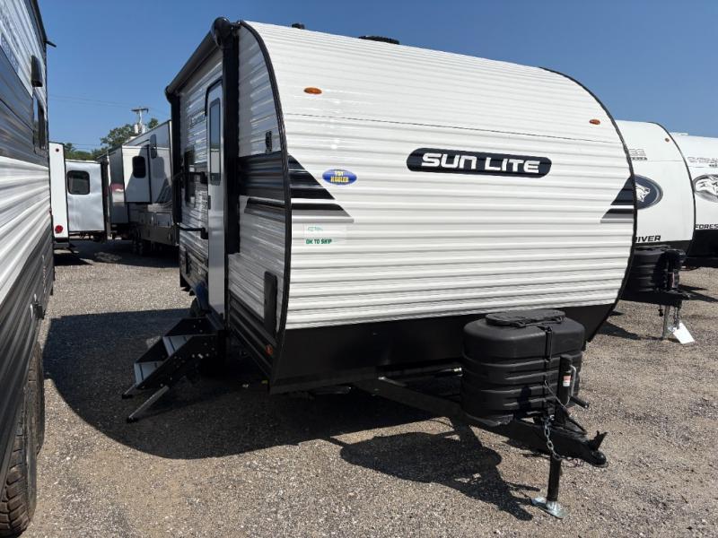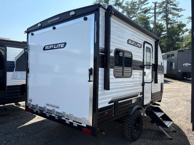 You can trust the build and enjoy your experience with any one of these Sunset Park RV Sun Lite travel trailers or toy haulers! Their aerodynamic profile is not only easy to haul, but also saves on fuel. They are built to withstand years of traveling even though they are lightweight with a diamond plate rock guard, a one piece PVC roof membrane, Dexter Spring-Leaf axles, and tinted safety glass windows. Some comfort standards you are sure to enjoy are the two-burner stove top range with hood, light and fan, plus the refrigerator and microwave, and an outside shower to help keep the dirt outdoors where it belongs.