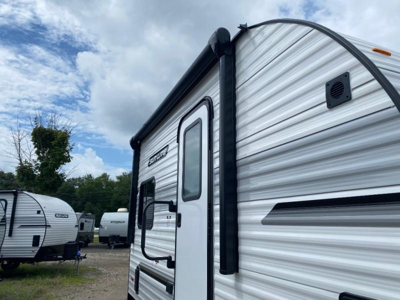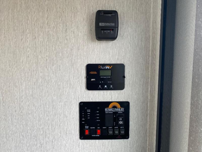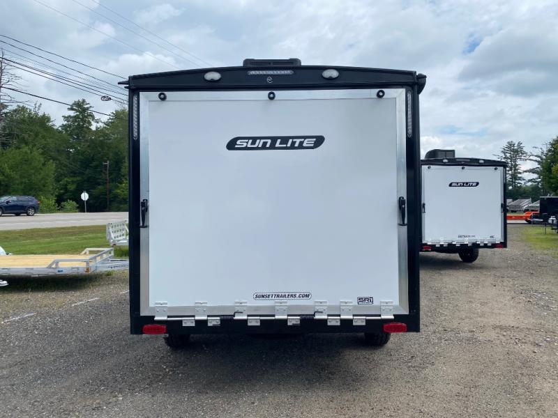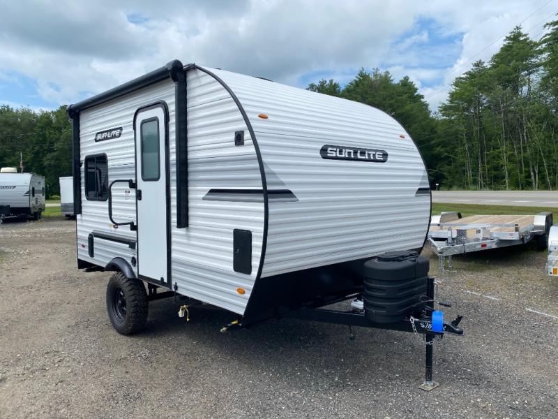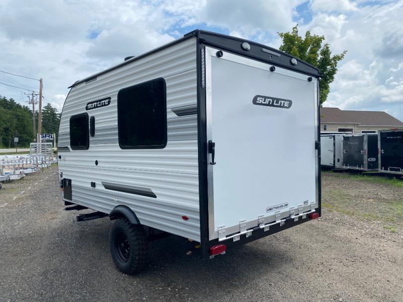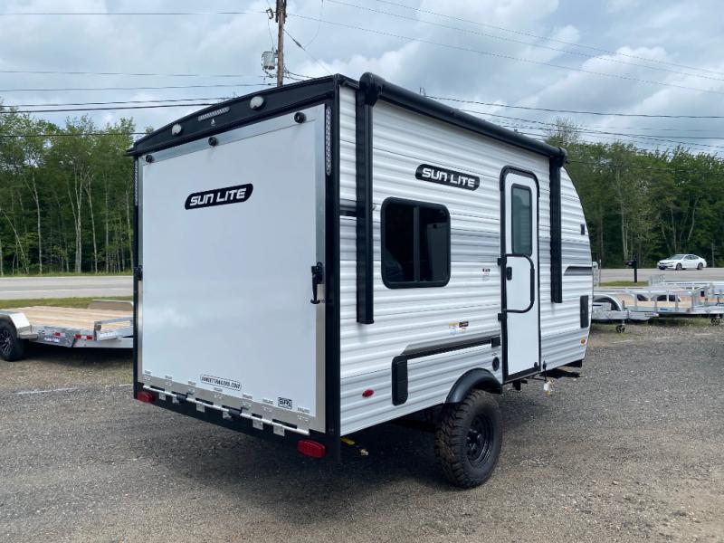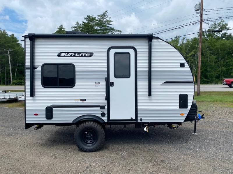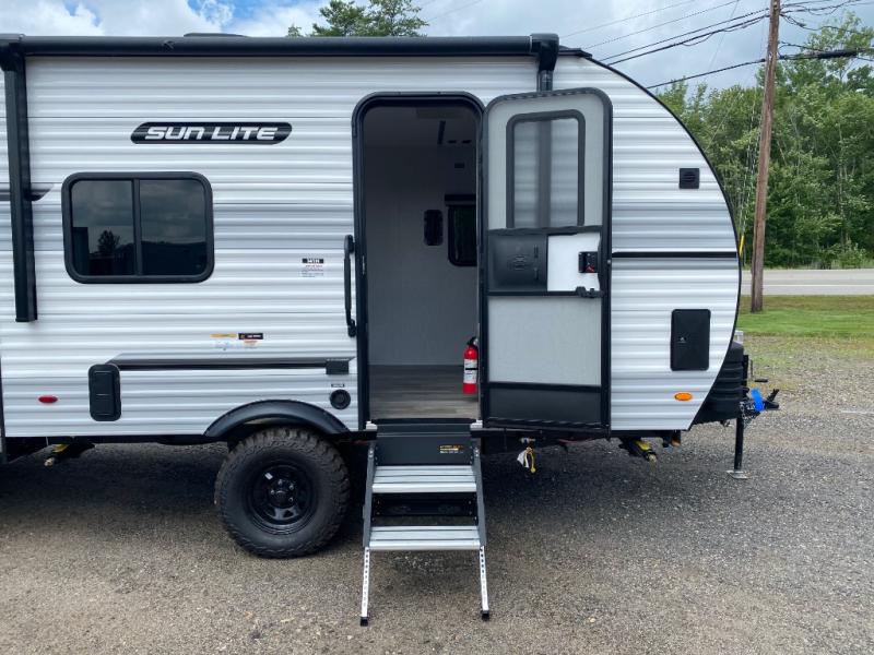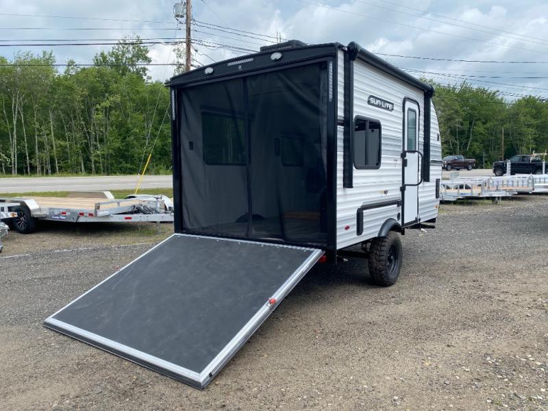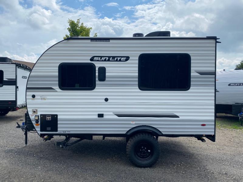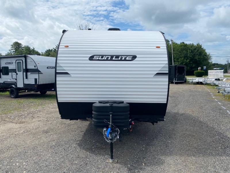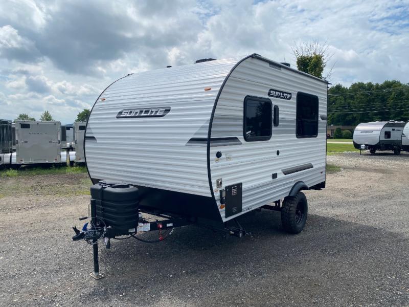 You can trust the build and enjoy your experience with any one of these Sunset Park RV Sun Lite travel trailers or toy haulers! Their aerodynamic profile is not only easy to haul, but also saves on fuel. They are built to withstand years of traveling even though they are lightweight with a diamond plate rock guard, a one piece PVC roof membrane, Dexter Spring-Leaf axles, and tinted safety glass windows. Some comfort standards you are sure to enjoy are the two-burner stove top range with hood, light and fan, plus the refrigerator and microwave, and an outside shower to help keep the dirt outdoors where it belongs.