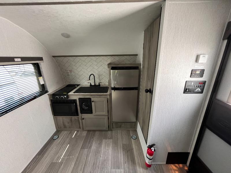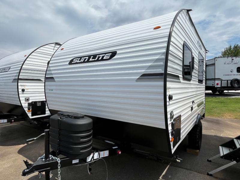 You can trust the build and enjoy your experience with any one of these Sunset Park RV Sun Lite travel trailers or toy haulers! Their aerodynamic profile is not only easy to haul, but also saves on fuel. They are built to withstand years of traveling even though they are lightweight with a diamond plate rock guard, a one piece PVC roof membrane, Dexter Spring-Leaf axles, and tinted safety glass windows. Some comfort standards you are sure to enjoy are the two-burner stove top range with hood, light and fan, plus the refrigerator and microwave, and an outside shower to help keep the dirt outdoors where it belongs.