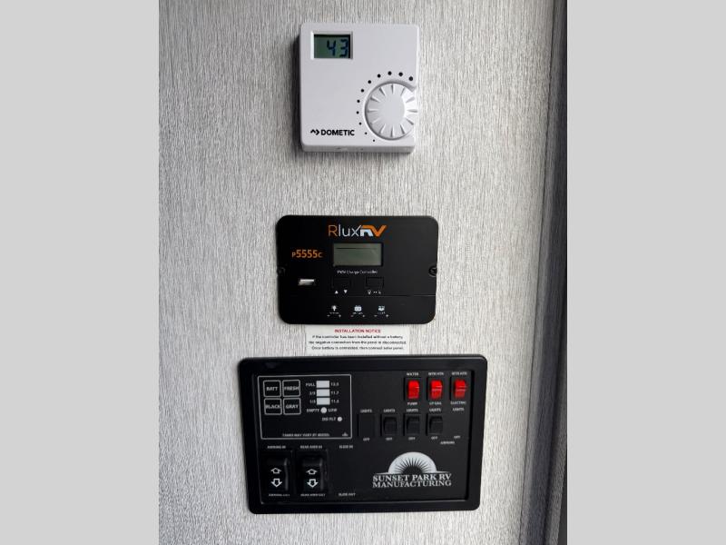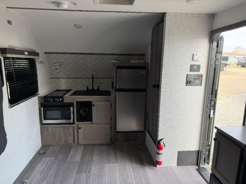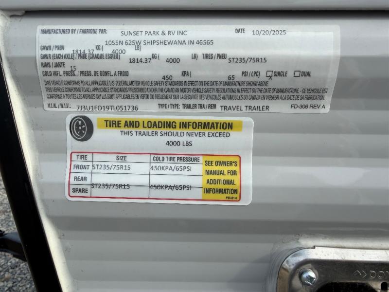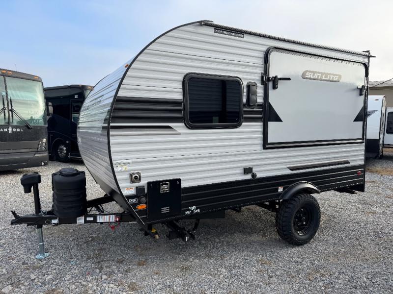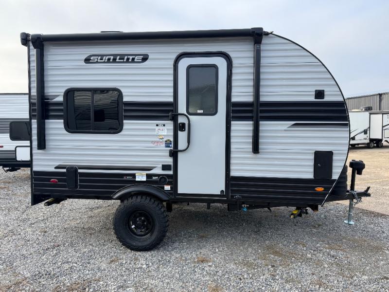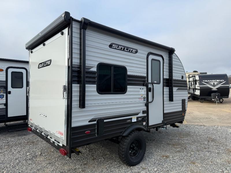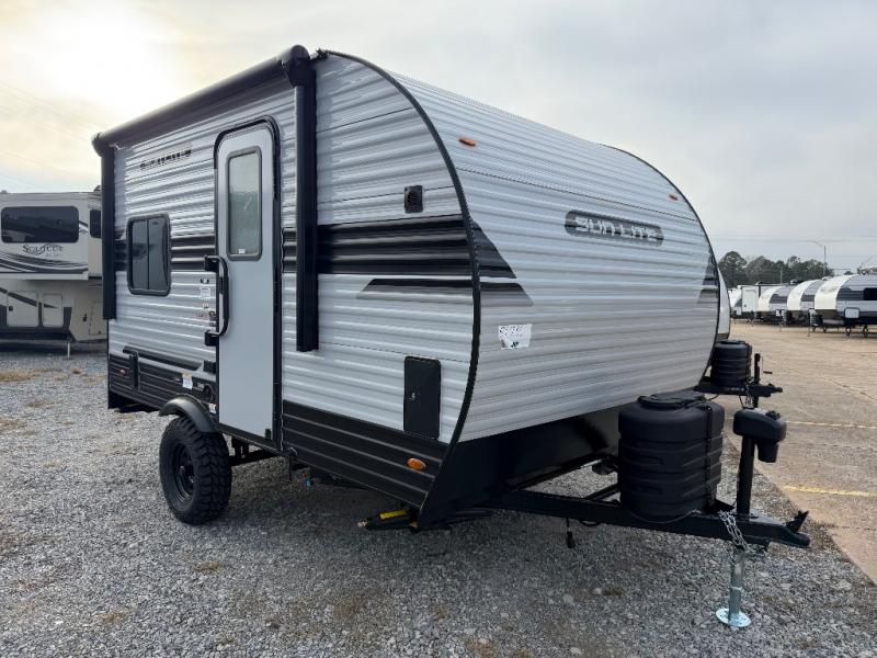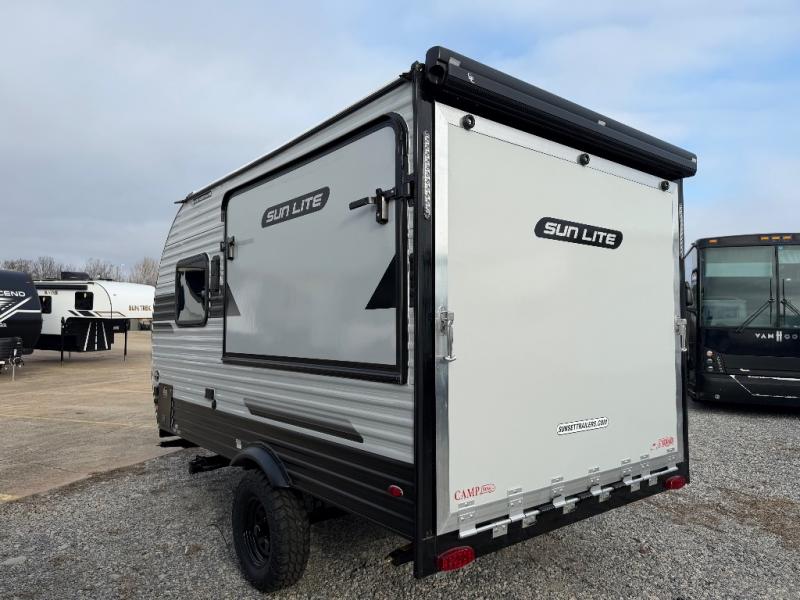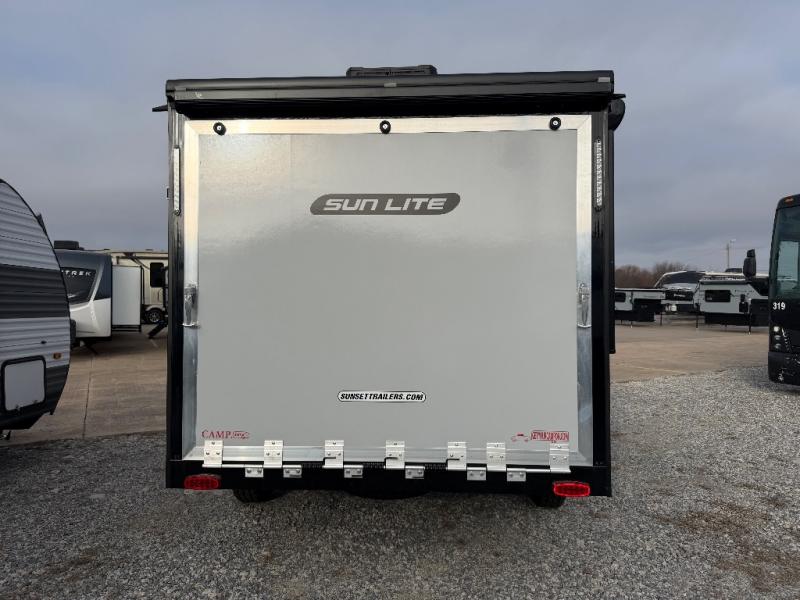 You can trust the build and enjoy your experience with any one of these Sunset Park RV Sun Lite travel trailers or toy haulers! Their aerodynamic profile is not only easy to haul, but also saves on fuel. They are built to withstand years of traveling even though they are lightweight with a diamond plate rock guard, a one piece PVC roof membrane, Dexter Spring-Leaf axles, and tinted safety glass windows. Some comfort standards you are sure to enjoy are the two-burner stove top range with hood, light and fan, plus the refrigerator and microwave, and an outside shower to help keep the dirt outdoors where it belongs.