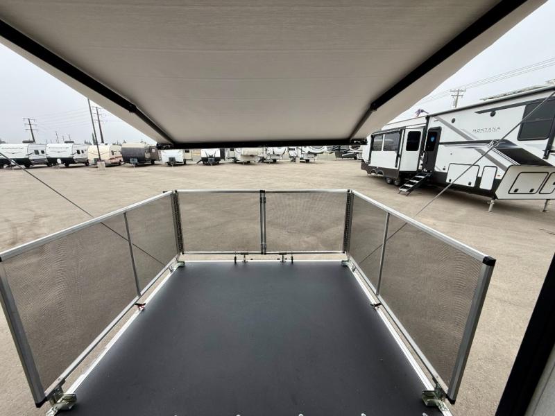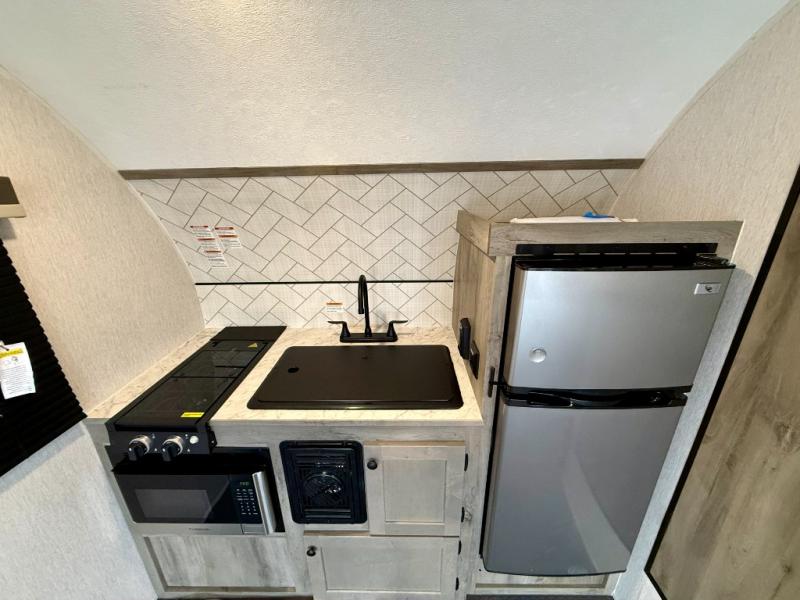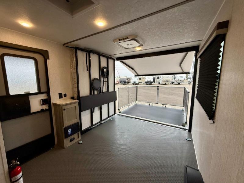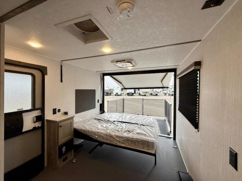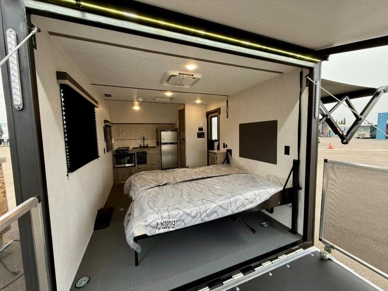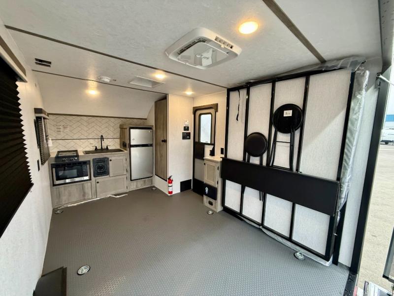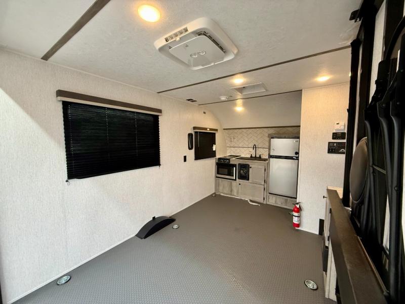 Get ready for a great camping experience where you can take along your favorite ride-on toys, kayaks, or other items that you may not normally have room to load as this toy hauler features a 6' 9" cargo width and 10' 11" cargo length. Once unloaded, set up with the rear bed that will make for a great night's rest. The front of this unit is shared with the wet bath and kitchen. Here, you can make meals on the two burner stove and there is a refrigerator for perishables. This unit also includes the Rush Toy Hauler Package with a ramp door, dual cargo loading lights, a magnetic rear bug screen, and four D-rings to secure your toys.