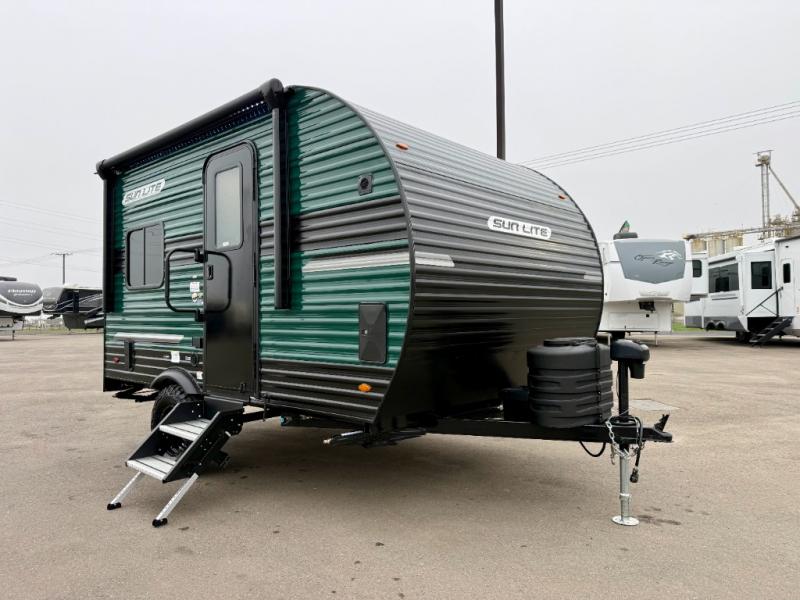 You can trust the build and enjoy your experience with any one of these Sunset Park RV Sun Lite travel trailers or toy haulers! Their aerodynamic profile is not only easy to haul, but also saves on fuel. They are built to withstand years of traveling even though they are lightweight with a diamond plate rock guard, a one piece PVC roof membrane, Dexter Spring-Leaf axles, and tinted safety glass windows. Some comfort standards you are sure to enjoy are the two-burner stove top range with hood, light and fan, plus the refrigerator and microwave, and an outside shower to help keep the dirt outdoors where it belongs.