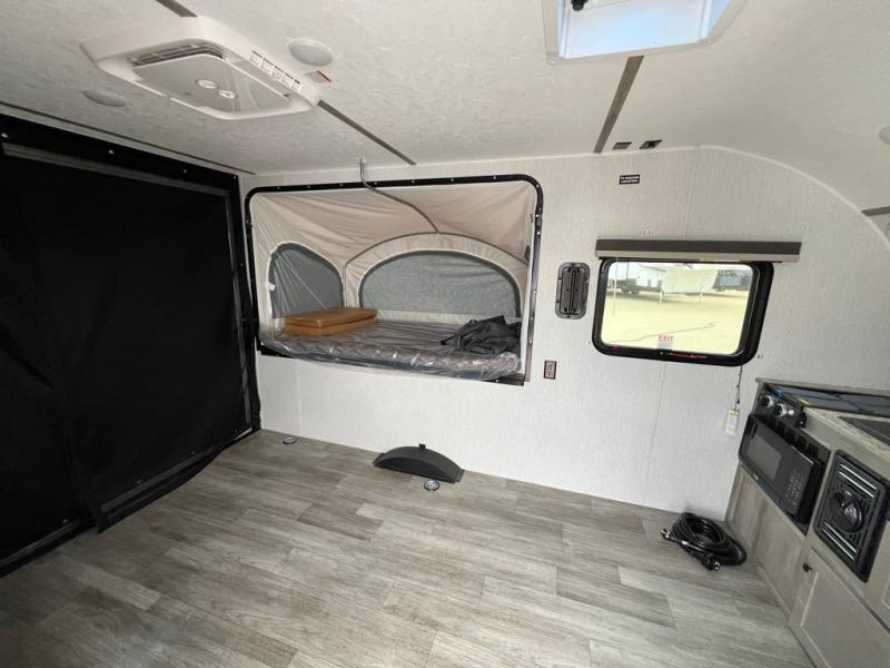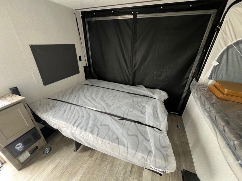 Get ready for a great camping experience where you can take along your favorite ride-on toys, kayaks, or other items that you may not normally have room to load as this toy hauler features a 6' 9" cargo width and 10' 11" cargo length. Once unloaded, set up with the rear bed that will make for a great night's rest. The front of this unit is shared with the wet bath and kitchen. Here, you can make meals on the two burner stove or in the microwave oven, and there is a refrigerator for perishables. And when the optional tent bed is added on this model, you can sleep more campers!