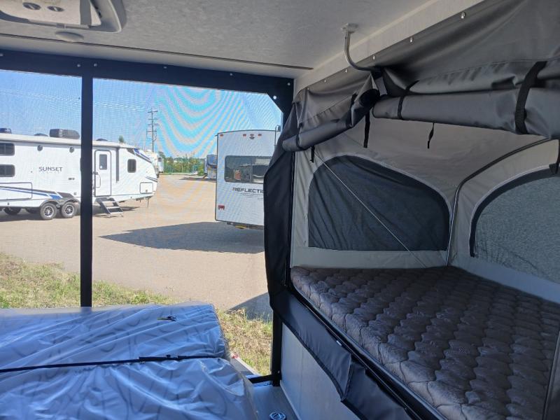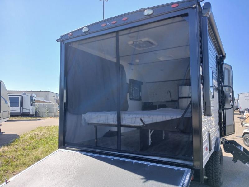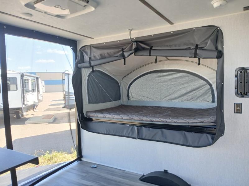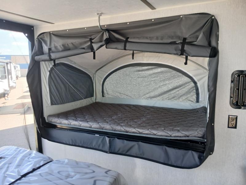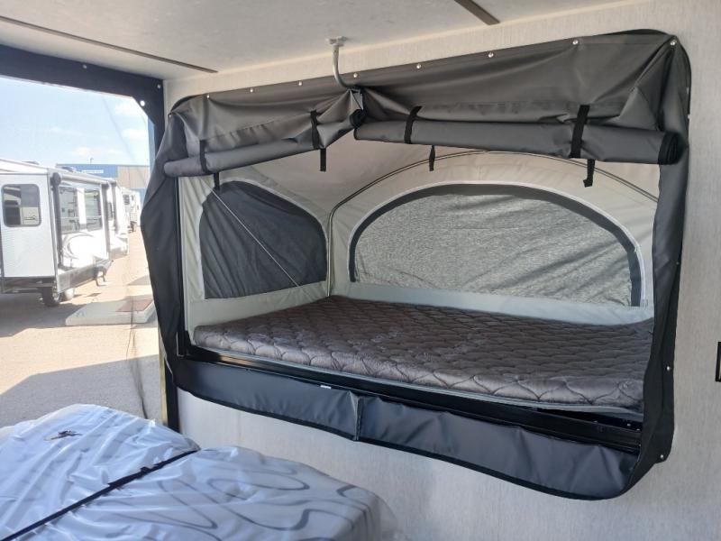 Get ready for a great camping experience where you can take along your favorite ride-on toys, kayaks, or other items that you may not normally have room to load as this toy hauler features a 6' 9" cargo width and 10' 11" cargo length. Once unloaded, set up with the rear bed that will make for a great night's rest. The front of this unit is shared with the wet bath and kitchen. Here, you can make meals on the two burner stove or in the microwave oven, and there is a refrigerator for perishables. And when the optional tent bed is added on this model, you can sleep more campers!