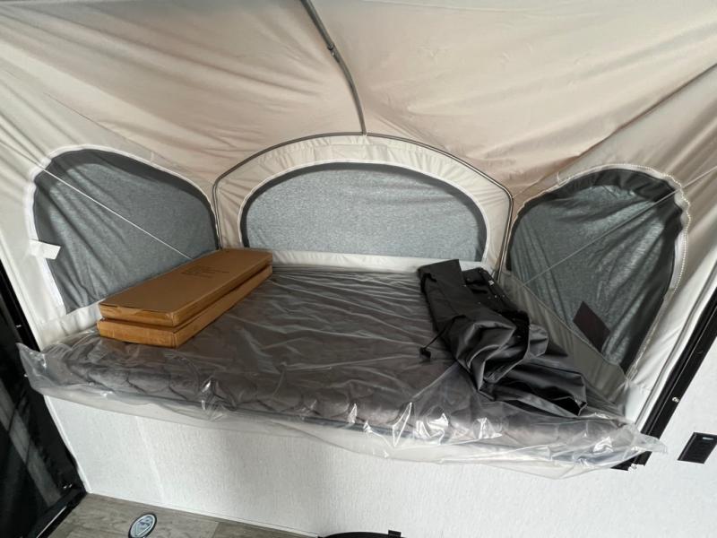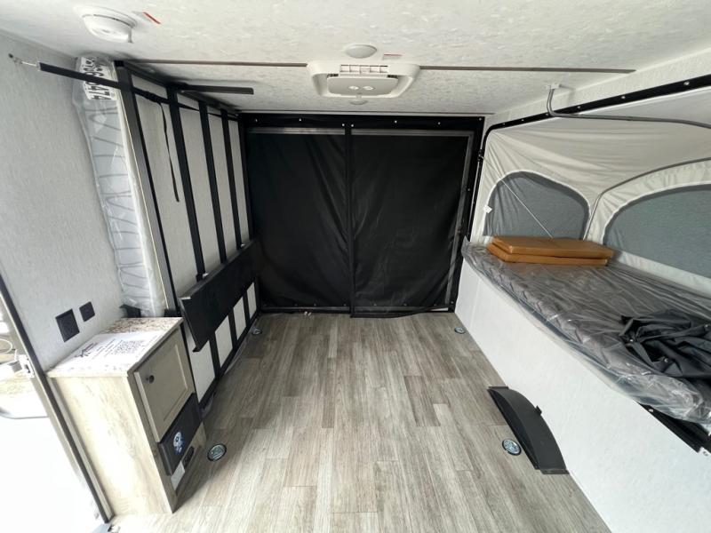 Get ready for a great camping experience where you can take along your favorite ride-on toys, kayaks, or other items that you may not normally have room to load as this toy hauler features a 6' 9" cargo width and 10' 11" cargo length. Once unloaded, set up with the rear bed that will make for a great night's rest. The front of this unit is shared with the wet bath and kitchen. Here, you can make meals on the two burner stove or in the microwave oven, and there is a refrigerator for perishables. And when the optional tent bed is added on this model, you can sleep more campers!