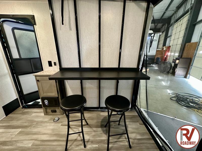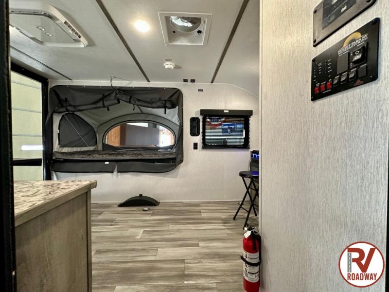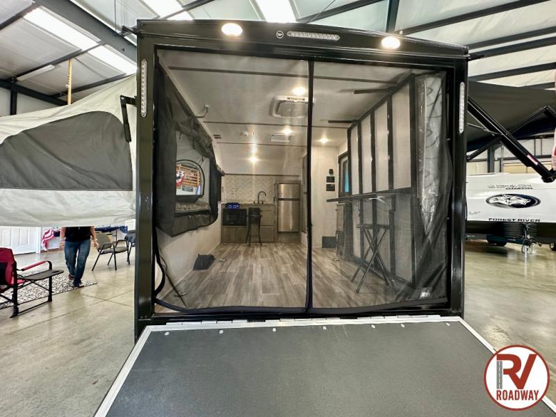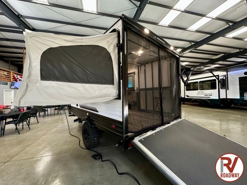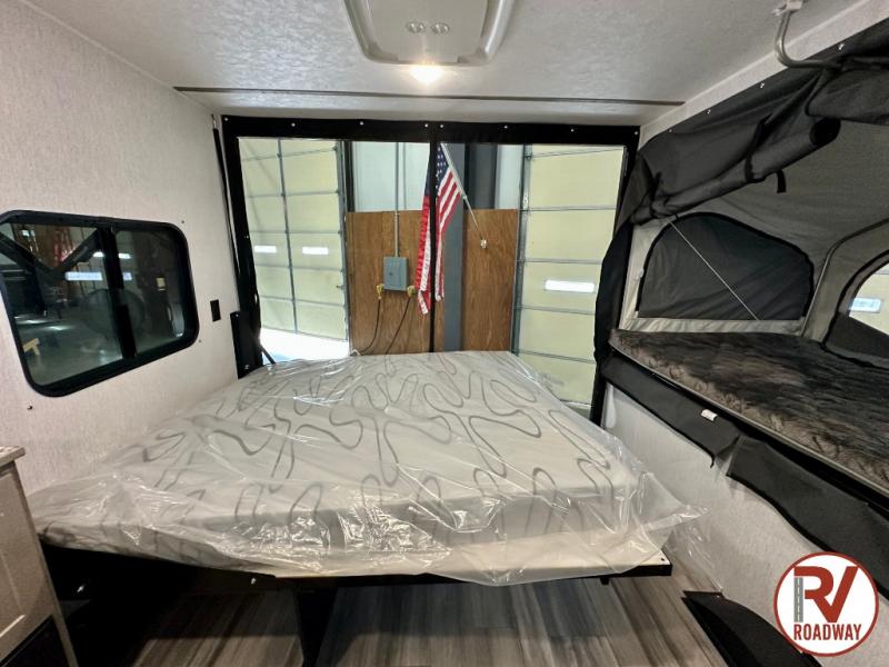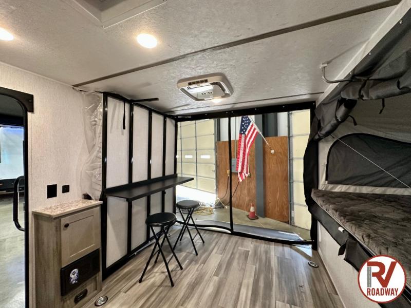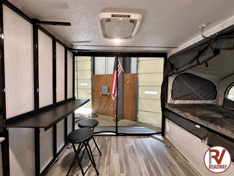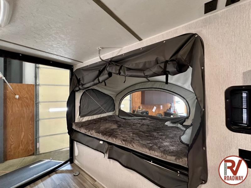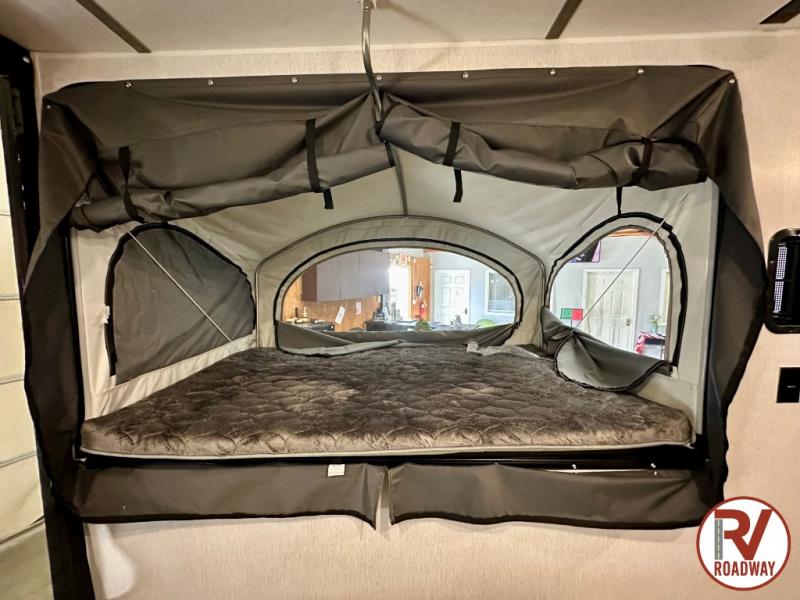 Get ready for a great camping experience where you can take along your favorite ride-on toys, kayaks, or other items that you may not normally have room to load as this toy hauler features a 6' 9" cargo width and 10' 11" cargo length. Once unloaded, set up with the rear bed that will make for a great night's rest. The front of this unit is shared with the wet bath and kitchen. Here, you can make meals on the two burner stove or in the microwave oven, and there is a refrigerator for perishables. And when the optional tent bed is added on this model, you can sleep more campers!