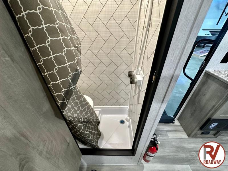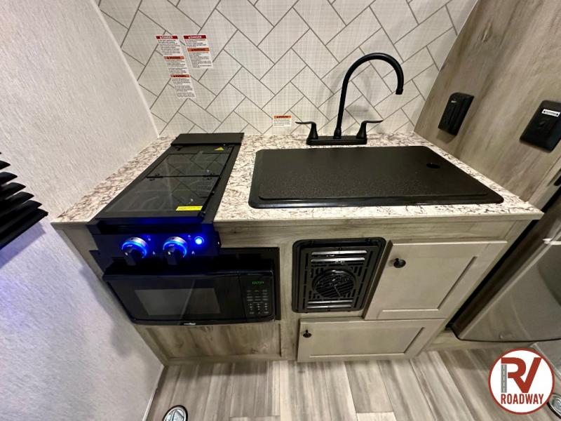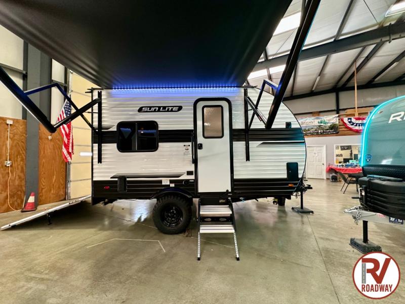 You can trust the build and enjoy your experience with any one of these Sunset Park RV Sun Lite travel trailers or toy haulers! Their aerodynamic profile is not only easy to haul, but also saves on fuel. They are built to withstand years of traveling even though they are lightweight with a diamond plate rock guard, a one piece PVC roof membrane, Dexter Spring-Leaf axles, and tinted safety glass windows. Some comfort standards you are sure to enjoy are the two-burner stove top range with hood, light and fan, plus the refrigerator and microwave, and an outside shower to help keep the dirt outdoors where it belongs.