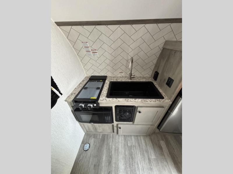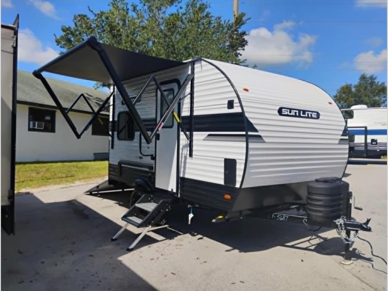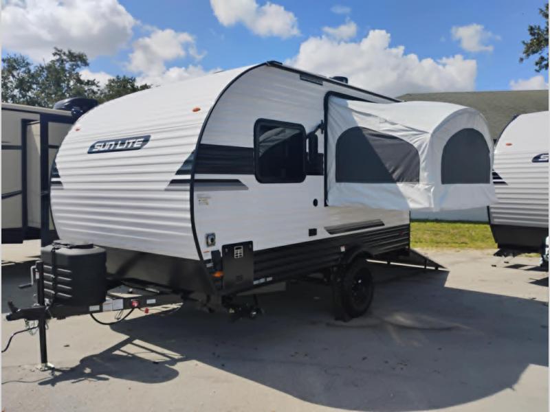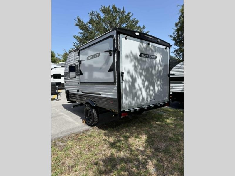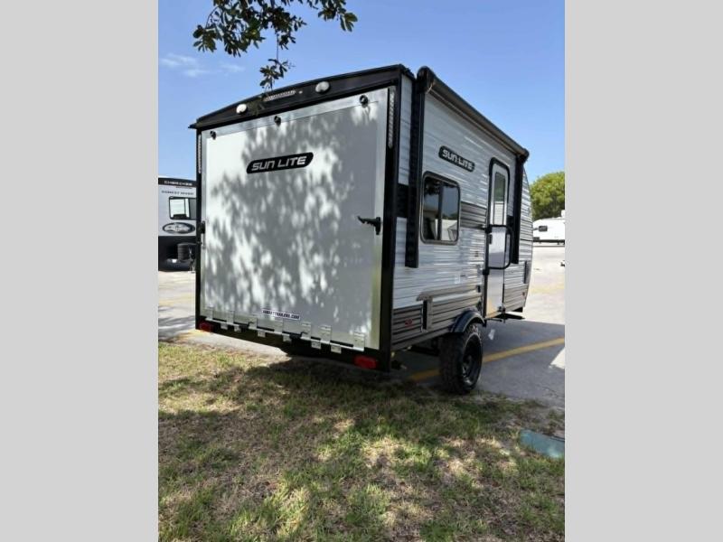 You can trust the build and enjoy your experience with any one of these Sunset Park RV Sun Lite travel trailers or toy haulers! Their aerodynamic profile is not only easy to haul, but also saves on fuel. They are built to withstand years of traveling even though they are lightweight with a diamond plate rock guard, a one piece PVC roof membrane, Dexter Spring-Leaf axles, and tinted safety glass windows. Some comfort standards you are sure to enjoy are the two-burner stove top range with hood, light and fan, plus the refrigerator and microwave, and an outside shower to help keep the dirt outdoors where it belongs.