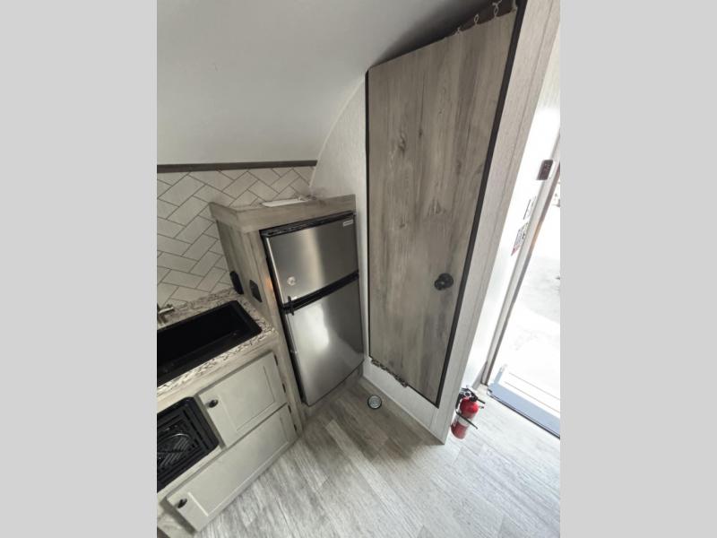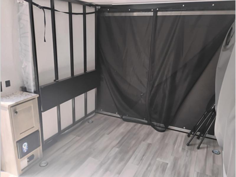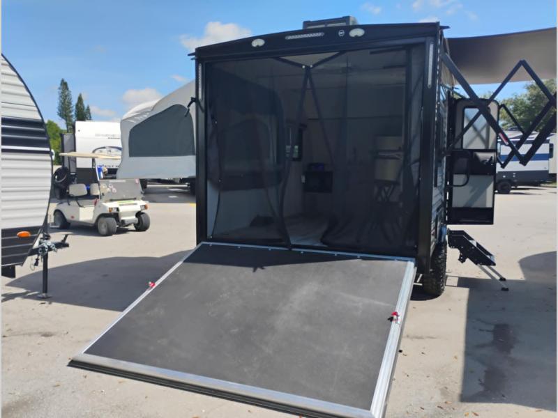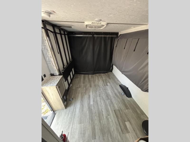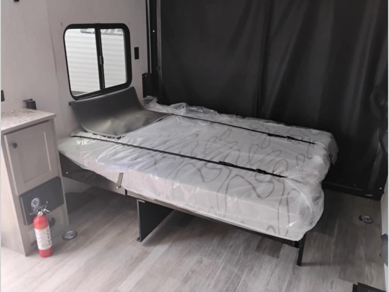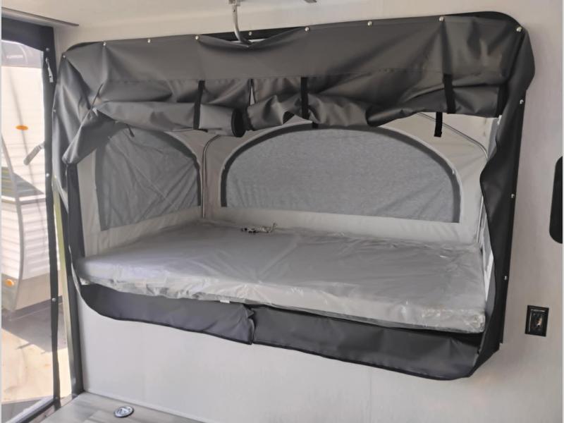 Get ready for a great camping experience where you can take along your favorite ride-on toys, kayaks, or other items that you may not normally have room to load as this toy hauler features a 6' 9" cargo width and 10' 11" cargo length. Once unloaded, set up with the rear bed that will make for a great night's rest. The front of this unit is shared with the wet bath and kitchen. Here, you can make meals on the two burner stove or in the microwave oven, and there is a refrigerator for perishables. And when the optional tent bed is added on this model, you can sleep more campers!