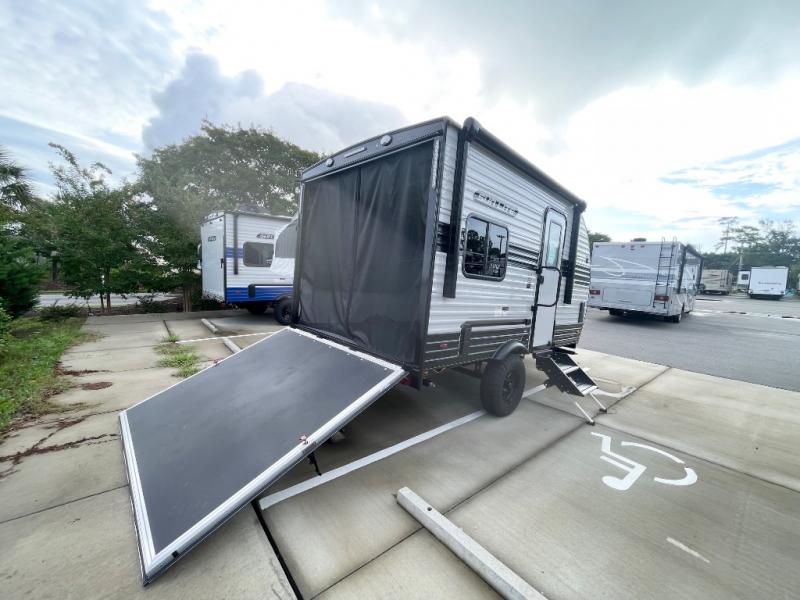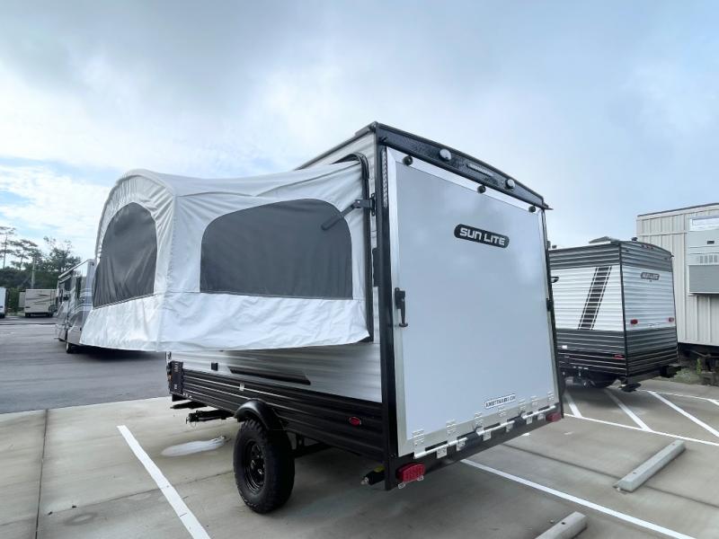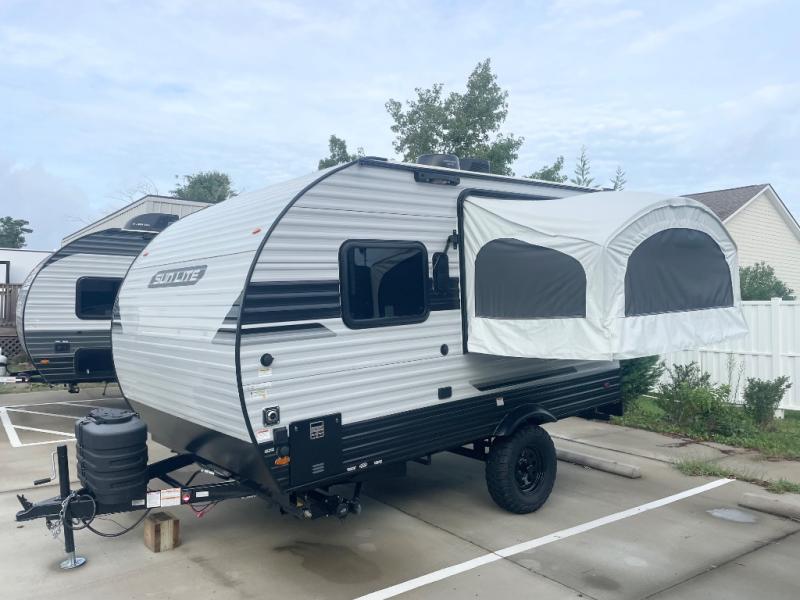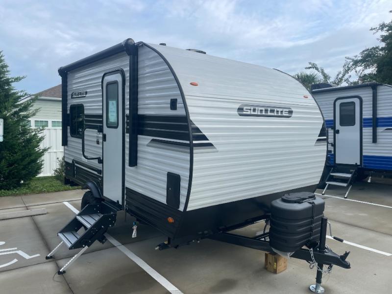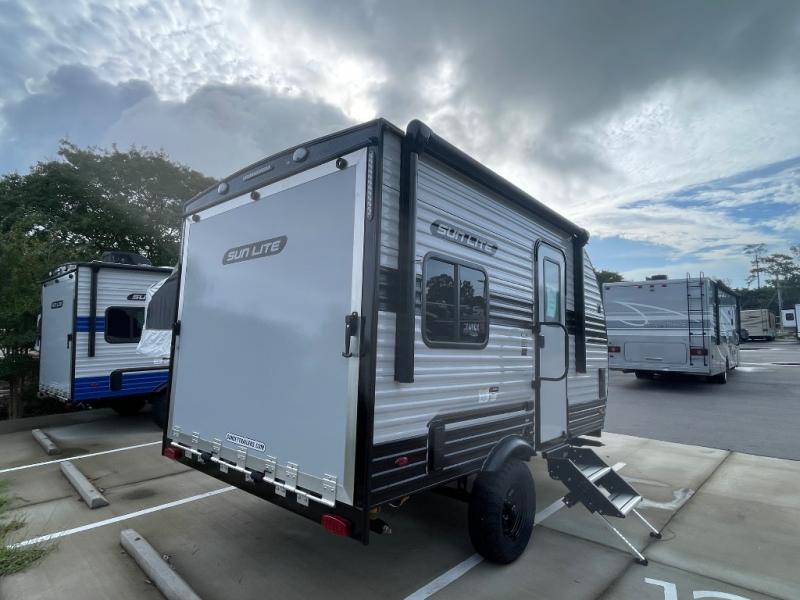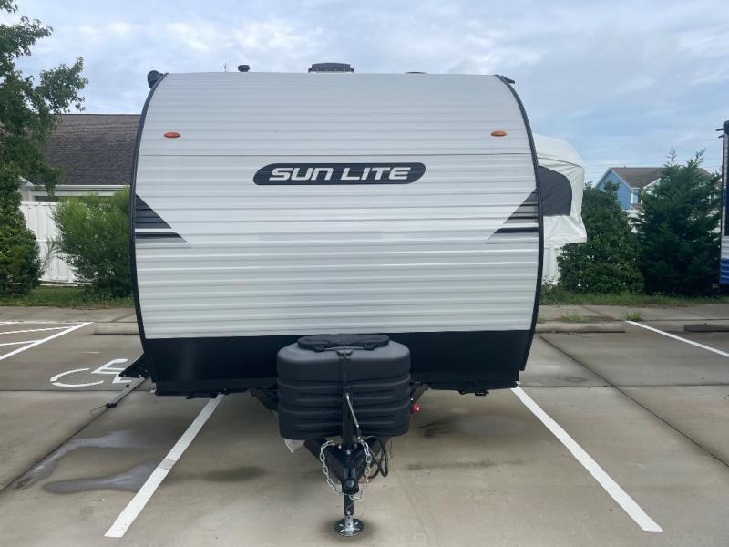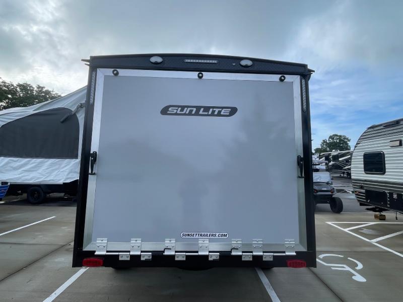 You can trust the build and enjoy your experience with any one of these Sunset Park RV Sun Lite travel trailers or toy haulers! Their aerodynamic profile is not only easy to haul, but also saves on fuel. They are built to withstand years of traveling even though they are lightweight with a diamond plate rock guard, a one piece PVC roof membrane, Dexter Spring-Leaf axles, and tinted safety glass windows. Some comfort standards you are sure to enjoy are the two-burner stove top range with hood, light and fan, plus the refrigerator and microwave, and an outside shower to help keep the dirt outdoors where it belongs.
