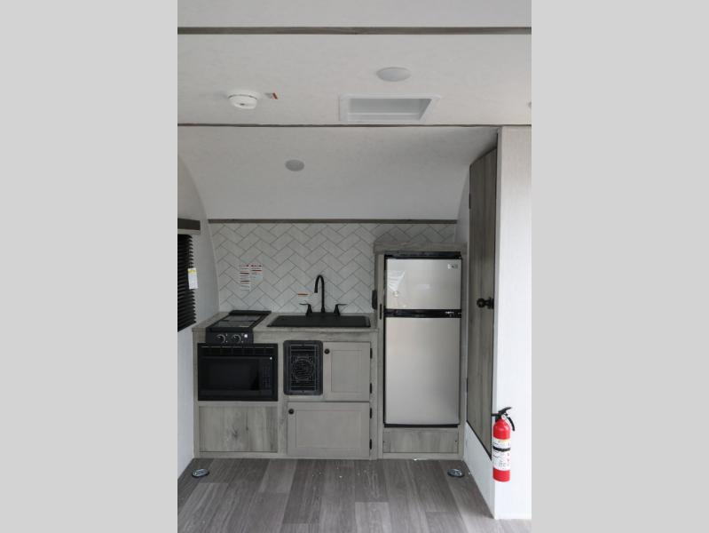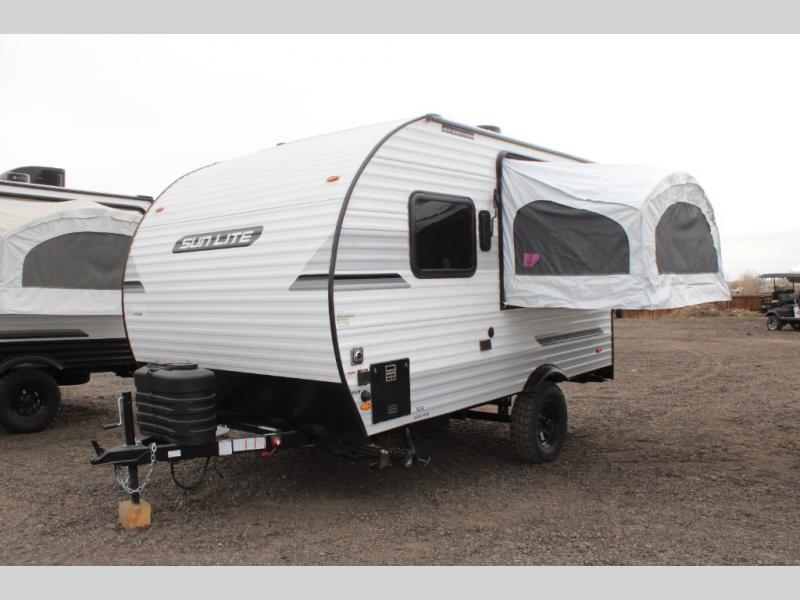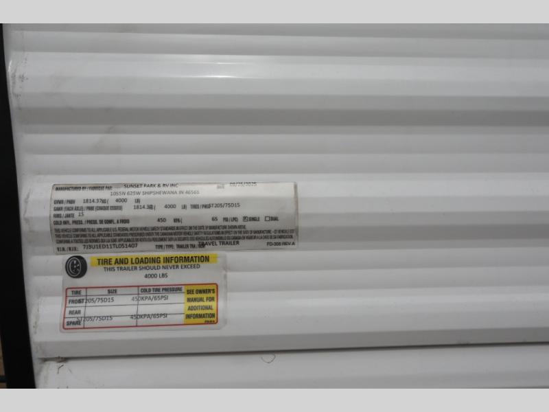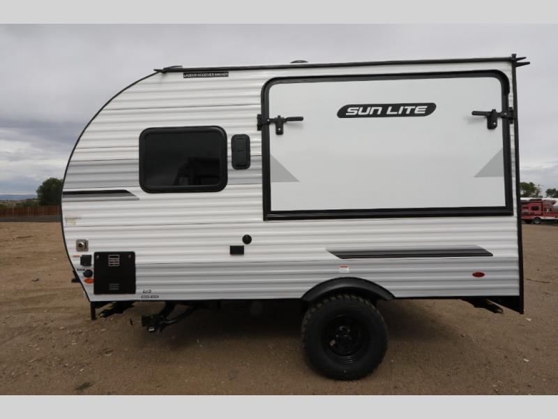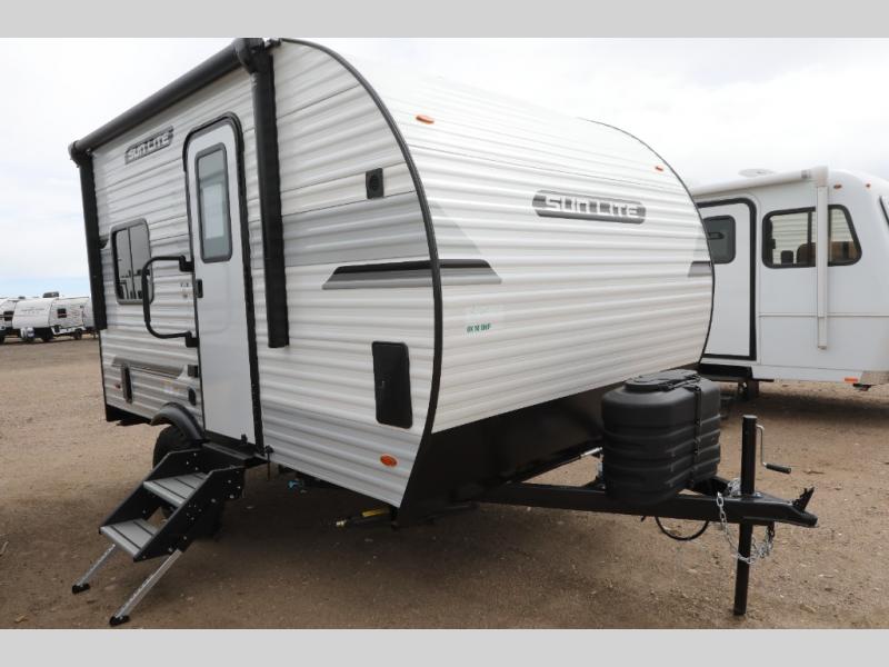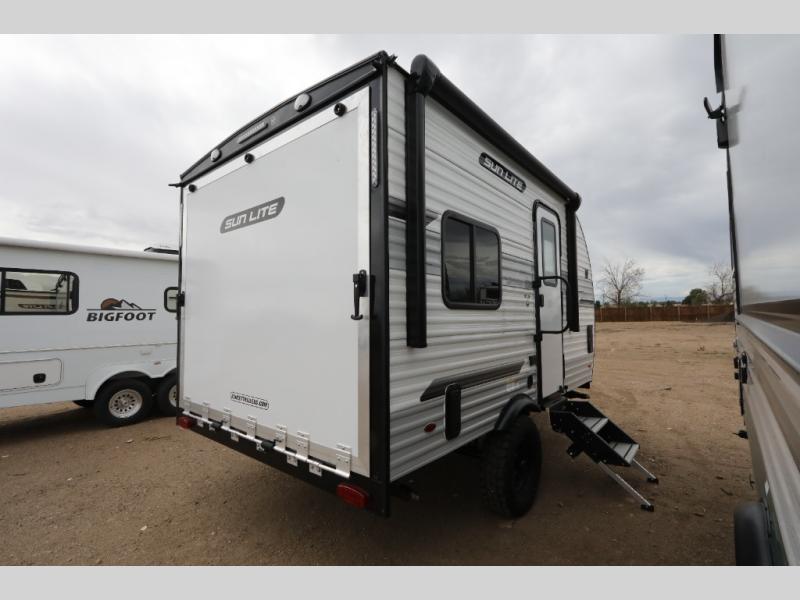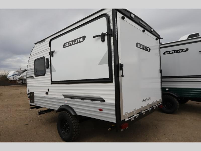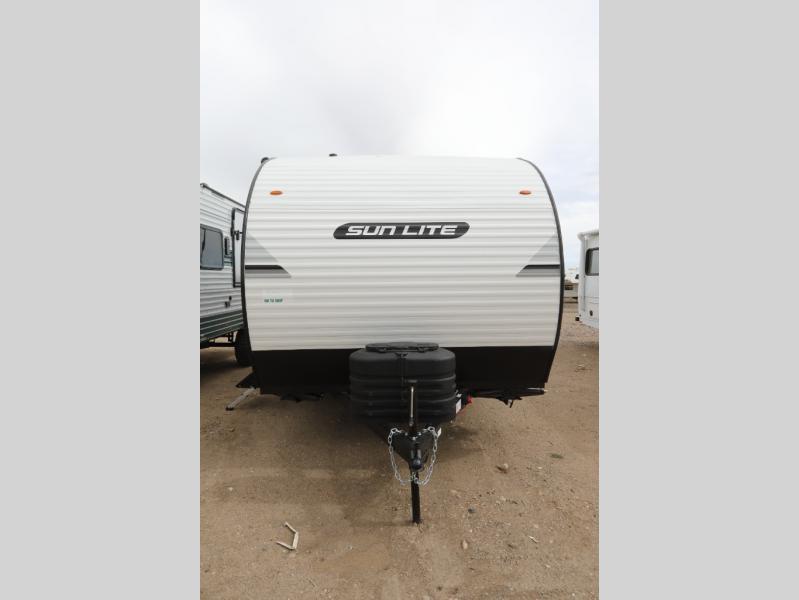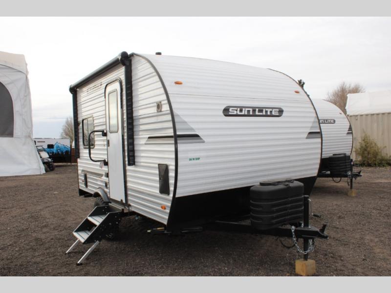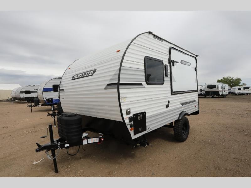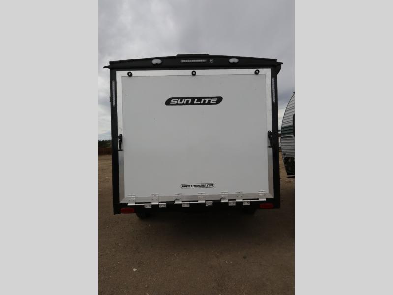 You can trust the build and enjoy your experience with any one of these Sunset Park RV Sun Lite travel trailers or toy haulers! Their aerodynamic profile is not only easy to haul, but also saves on fuel. They are built to withstand years of traveling even though they are lightweight with a diamond plate rock guard, a one piece PVC roof membrane, Dexter Spring-Leaf axles, and tinted safety glass windows. Some comfort standards you are sure to enjoy are the two-burner stove top range with hood, light and fan, plus the refrigerator and microwave, and an outside shower to help keep the dirt outdoors where it belongs.