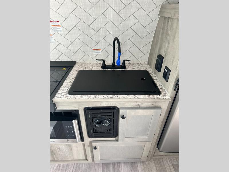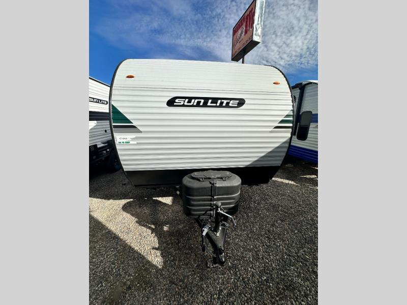 You can trust the build and enjoy your experience with any one of these Sunset Park RV Sun Lite travel trailers or toy haulers! Their aerodynamic profile is not only easy to haul, but also saves on fuel. They are built to withstand years of traveling even though they are lightweight with a diamond plate rock guard, a one piece PVC roof membrane, Dexter Spring-Leaf axles, and tinted safety glass windows. Some comfort standards you are sure to enjoy are the two-burner stove top range with hood, light and fan, plus the refrigerator and microwave, and an outside shower to help keep the dirt outdoors where it belongs.