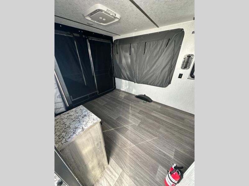 Get ready for a great camping experience where you can take along your favorite ride-on toys, kayaks, or other items that you may not normally have room to load as this toy hauler features a 6' 9" cargo width and 10' 11" cargo length. Once unloaded, set up with the rear bed that will make for a great night's rest. The front of this unit is shared with the wet bath and kitchen. Here, you can make meals on the two burner stove or in the microwave oven, and there is a refrigerator for perishables. And when the optional tent bed is added on this model, you can sleep more campers!