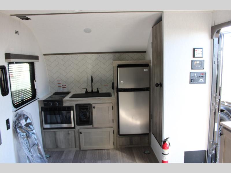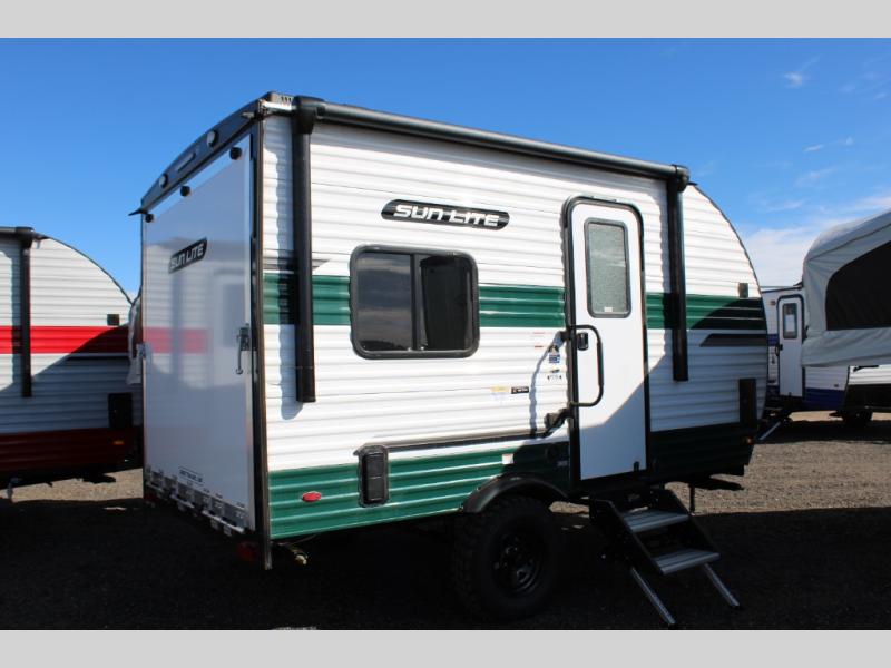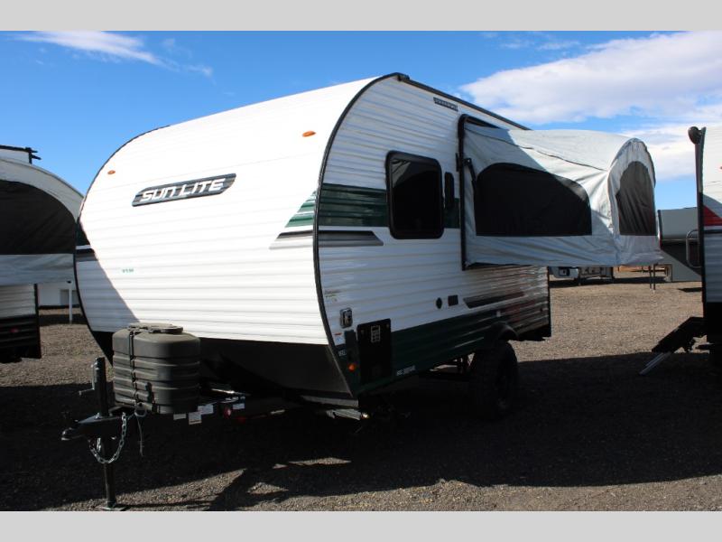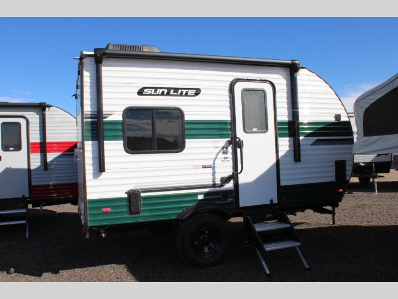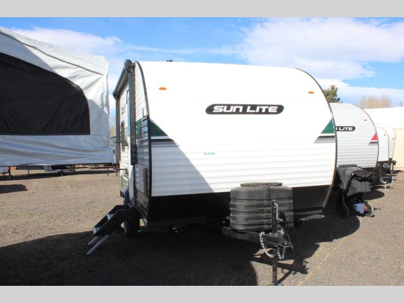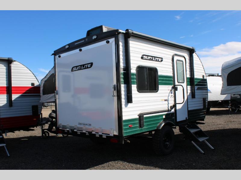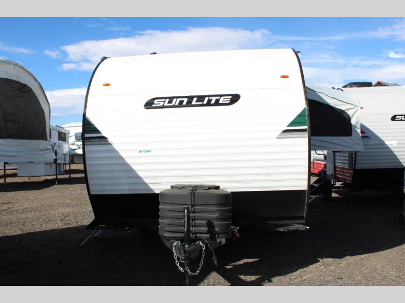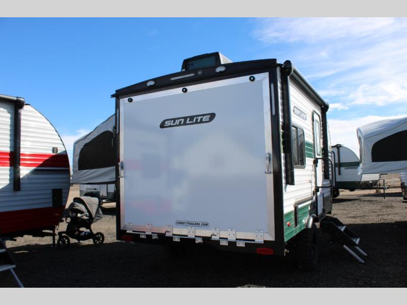 You can trust the build and enjoy your experience with any one of these Sunset Park RV Sun Lite travel trailers or toy haulers! Their aerodynamic profile is not only easy to haul, but also saves on fuel. They are built to withstand years of traveling even though they are lightweight with a diamond plate rock guard, a one piece PVC roof membrane, Dexter Spring-Leaf axles, and tinted safety glass windows. Some comfort standards you are sure to enjoy are the two-burner stove top range with hood, light and fan, plus the refrigerator and microwave, and an outside shower to help keep the dirt outdoors where it belongs.