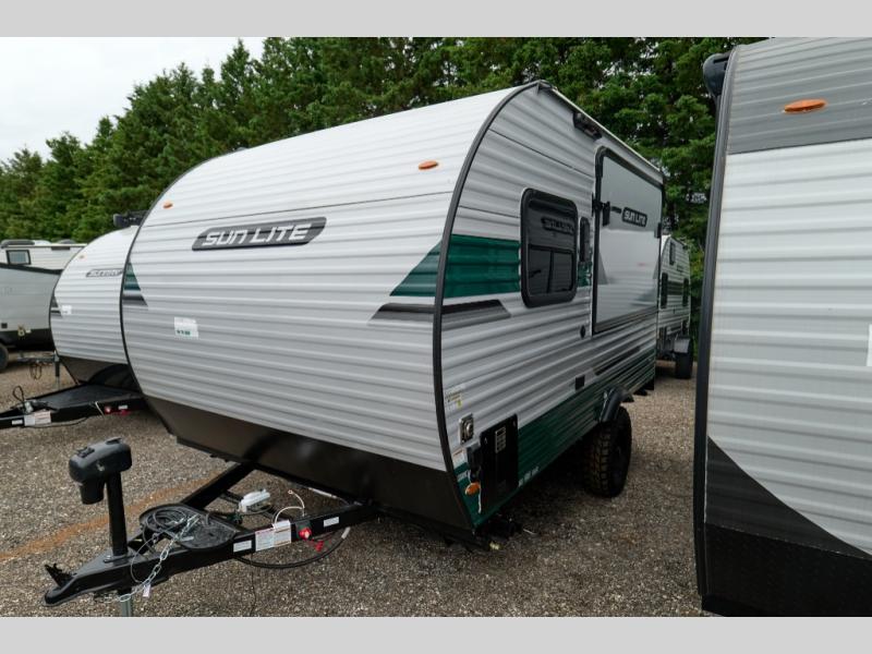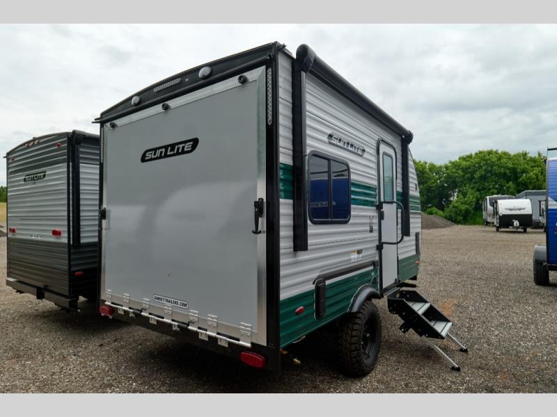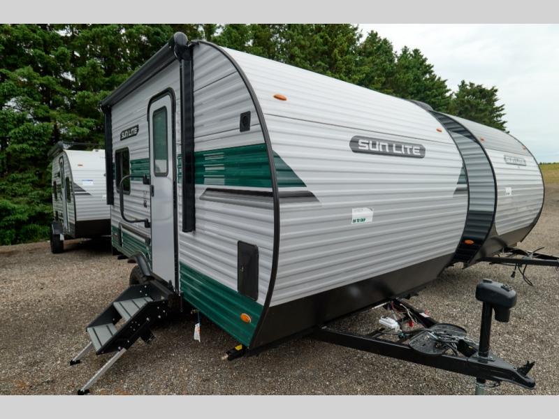 You can trust the build and enjoy your experience with any one of these Sunset Park RV Sun Lite travel trailers or toy haulers! Their aerodynamic profile is not only easy to haul, but also saves on fuel. They are built to withstand years of traveling even though they are lightweight with a diamond plate rock guard, a one piece PVC roof membrane, Dexter Spring-Leaf axles, and tinted safety glass windows. Some comfort standards you are sure to enjoy are the two-burner stove top range with hood, light and fan, plus the refrigerator and microwave, and an outside shower to help keep the dirt outdoors where it belongs.