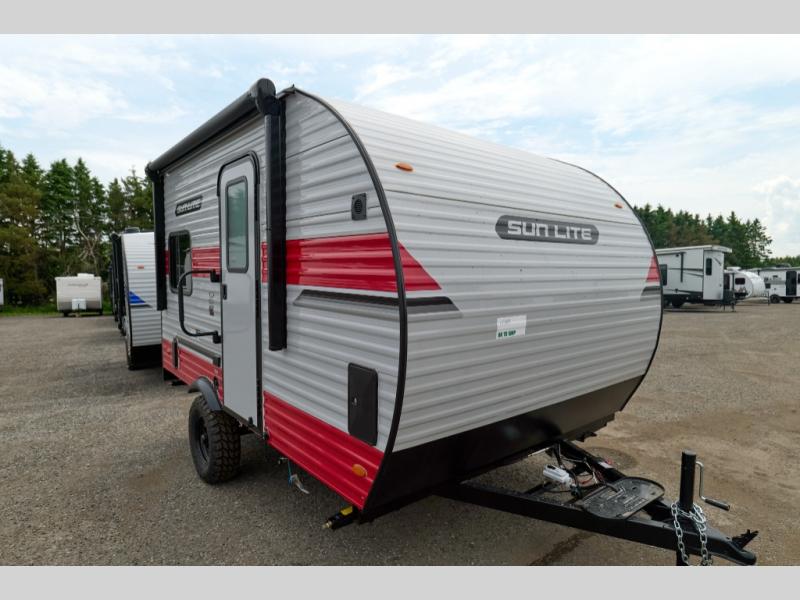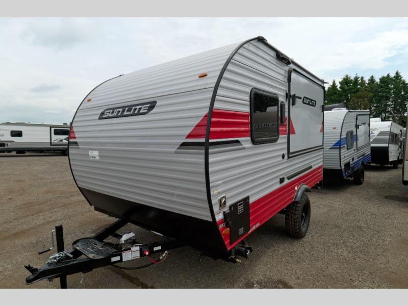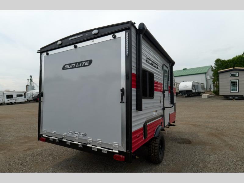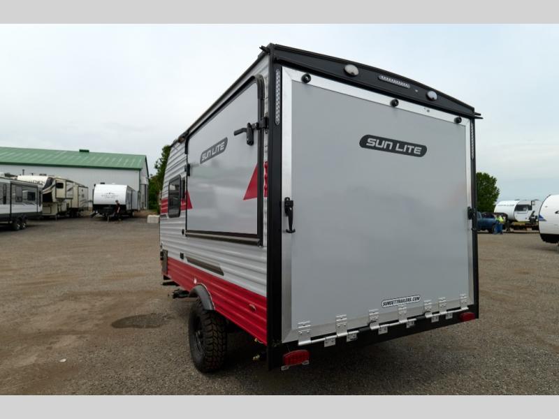 You can trust the build and enjoy your experience with any one of these Sunset Park RV Sun Lite travel trailers or toy haulers! Their aerodynamic profile is not only easy to haul, but also saves on fuel. They are built to withstand years of traveling even though they are lightweight with a diamond plate rock guard, a one piece PVC roof membrane, Dexter Spring-Leaf axles, and tinted safety glass windows. Some comfort standards you are sure to enjoy are the two-burner stove top range with hood, light and fan, plus the refrigerator and microwave, and an outside shower to help keep the dirt outdoors where it belongs.