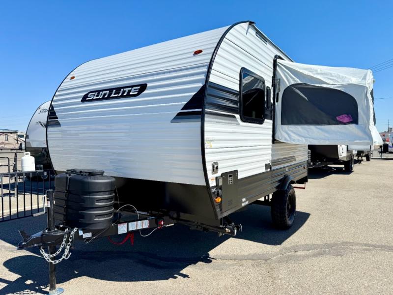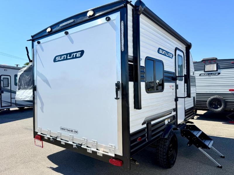 You can trust the build and enjoy your experience with any one of these Sunset Park RV Sun Lite travel trailers or toy haulers! Their aerodynamic profile is not only easy to haul, but also saves on fuel. They are built to withstand years of traveling even though they are lightweight with a diamond plate rock guard, a one piece PVC roof membrane, Dexter Spring-Leaf axles, and tinted safety glass windows. Some comfort standards you are sure to enjoy are the two-burner stove top range with hood, light and fan, plus the refrigerator and microwave, and an outside shower to help keep the dirt outdoors where it belongs.