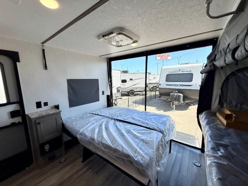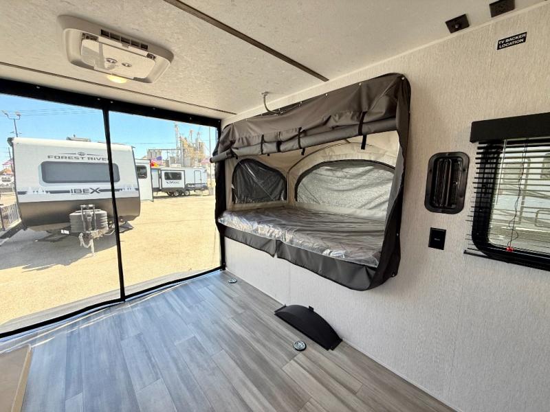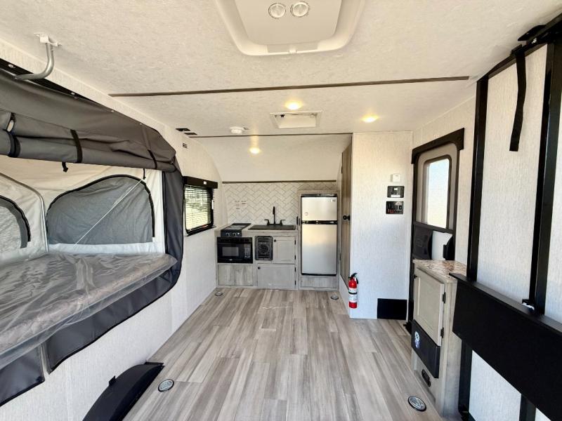 Get ready for a great camping experience where you can take along your favorite ride-on toys, kayaks, or other items that you may not normally have room to load as this toy hauler features a 6' 9" cargo width and 10' 11" cargo length. Once unloaded, set up with the rear bed that will make for a great night's rest. The front of this unit is shared with the wet bath and kitchen. Here, you can make meals on the two burner stove or in the microwave oven, and there is a refrigerator for perishables. And when the optional tent bed is added on this model, you can sleep more campers!