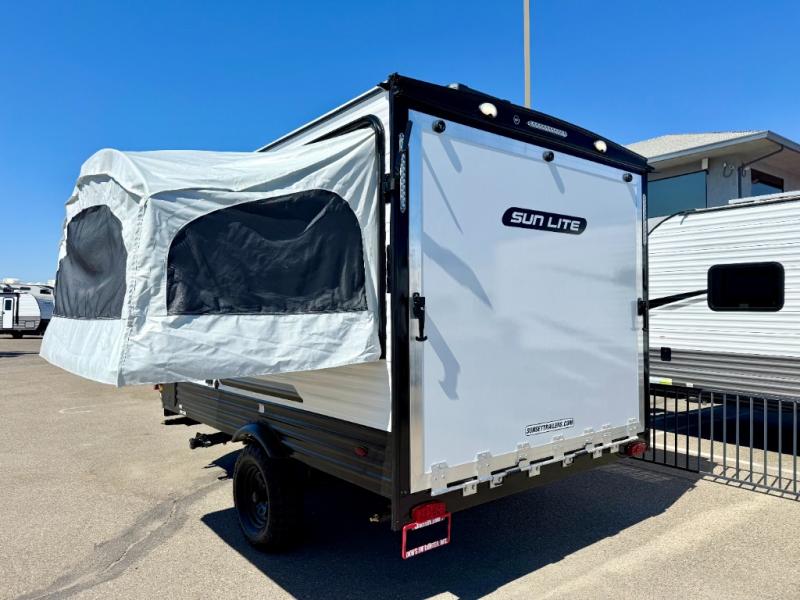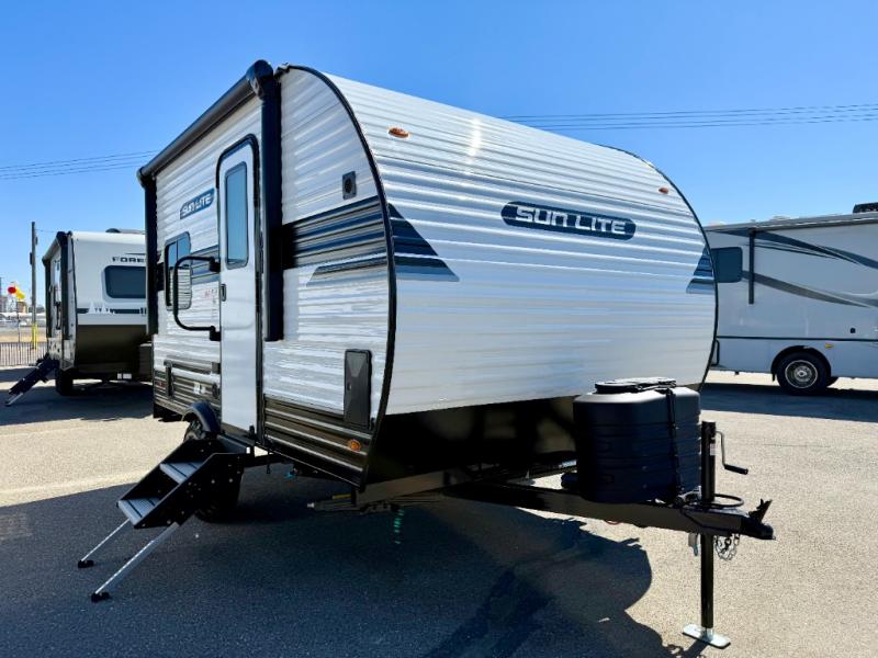 You can trust the build and enjoy your experience with any one of these Sunset Park RV Sun Lite travel trailers or toy haulers! Their aerodynamic profile is not only easy to haul, but also saves on fuel. They are built to withstand years of traveling even though they are lightweight with a diamond plate rock guard, a one piece PVC roof membrane, Dexter Spring-Leaf axles, and tinted safety glass windows. Some comfort standards you are sure to enjoy are the two-burner stove top range with hood, light and fan, plus the refrigerator and microwave, and an outside shower to help keep the dirt outdoors where it belongs.
