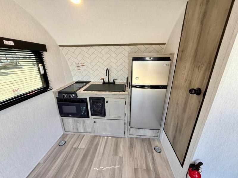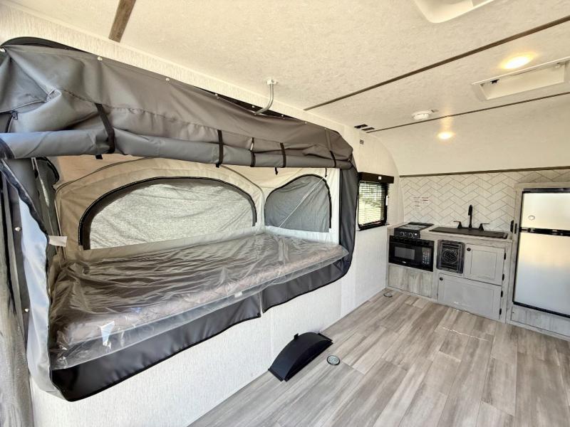 Get ready for a great camping experience where you can take along your favorite ride-on toys, kayaks, or other items that you may not normally have room to load as this toy hauler features a 6' 9" cargo width and 10' 11" cargo length. Once unloaded, set up with the rear bed that will make for a great night's rest. The front of this unit is shared with the wet bath and kitchen. Here, you can make meals on the two burner stove or in the microwave oven, and there is a refrigerator for perishables. And when the optional tent bed is added on this model, you can sleep more campers!