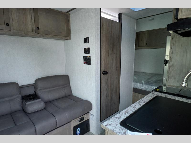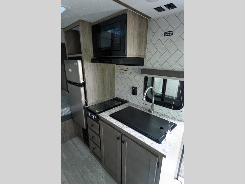 This compact travel trailer will be perfect for trips to the lake. Since there is a front bed, you won't have to sleep on an air mattress, and the convenient wet bath lets you freshen up each day. Breakfast can be made on two burner cooktop or in the microwave oven, and there is a refrigerator to keep your food fresh. This model also includes a sofa where you can relax in the evenings, and guests can sleep here if they want to tag along!