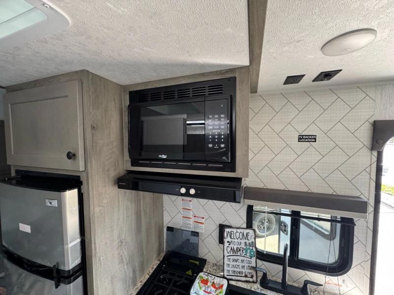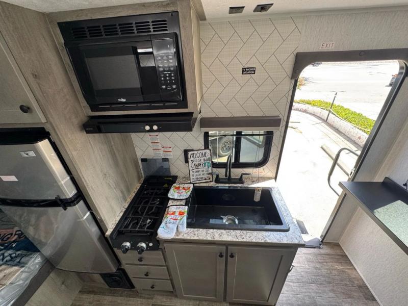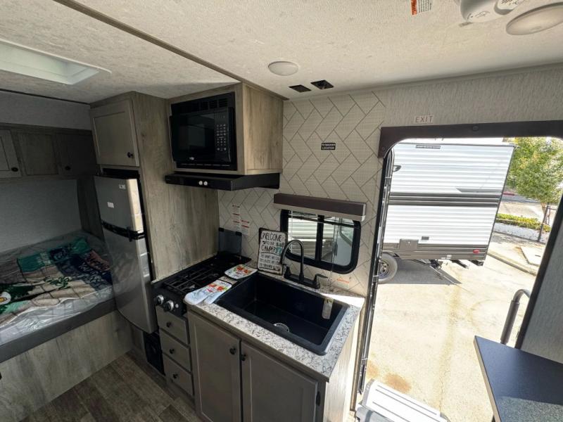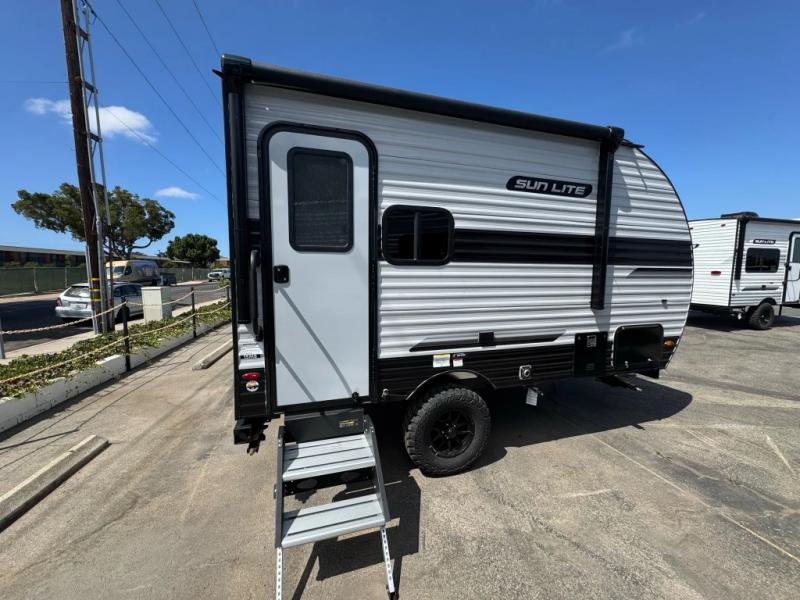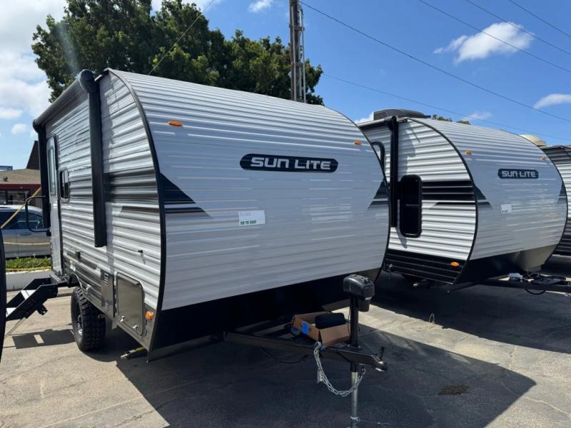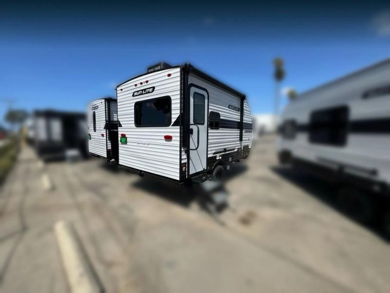 You can trust the build and enjoy your experience with any one of these Sunset Park RV Sun Lite travel trailers! Their aerodynamic profile is not only easy to haul, but also saves on fuel. They are built to withstand years of traveling even though they are lightweight with a diamond plate rock guard, a one piece PVC roof membrane, Dexter Spring-Leaf axles, and tinted safety glass windows. Some comfort standards you are sure to enjoy are the two-burner stove top range with hood, light and fan, plus the refrigerator and microwave, and an outside shower to help keep the dirt outdoors where it belongs.