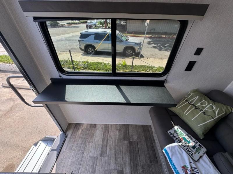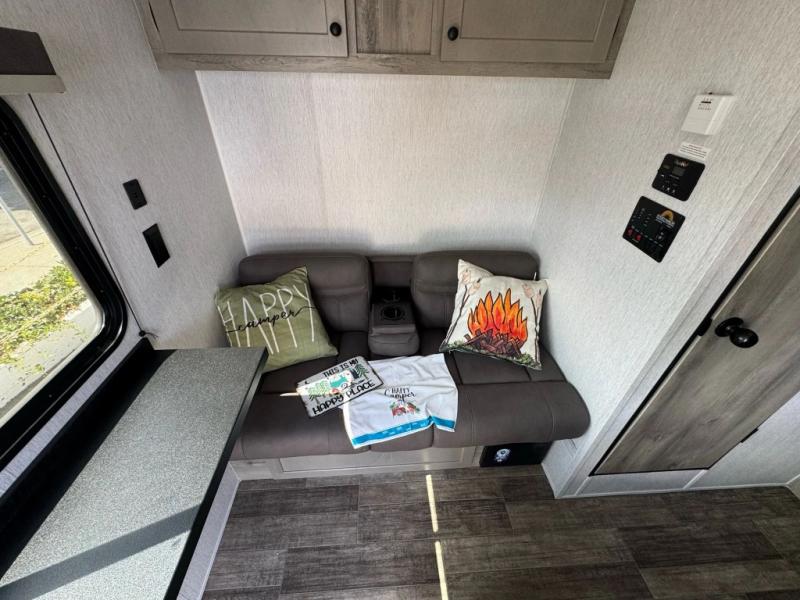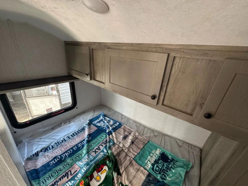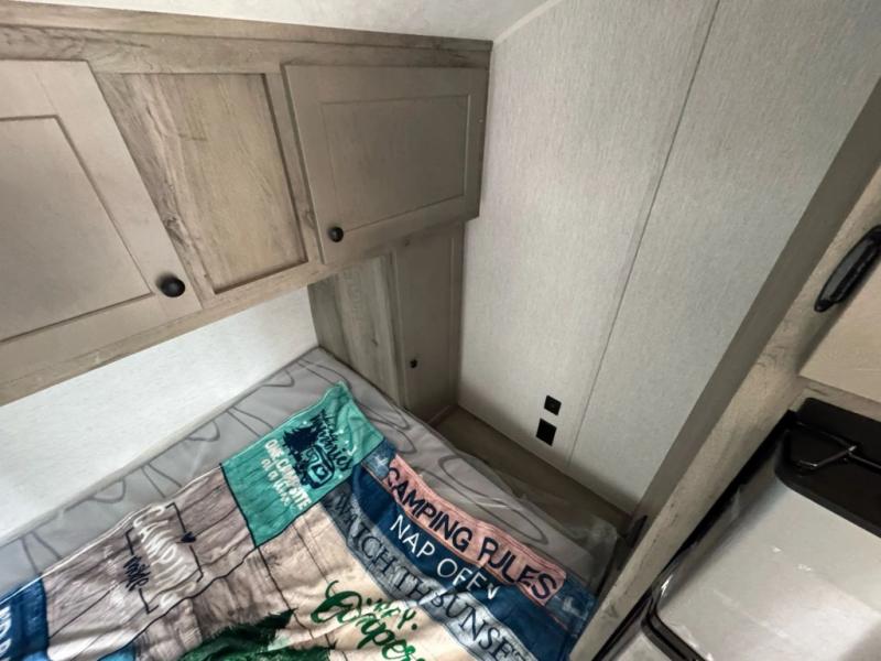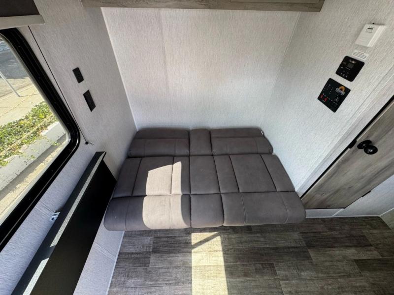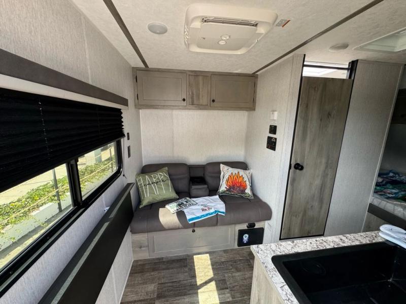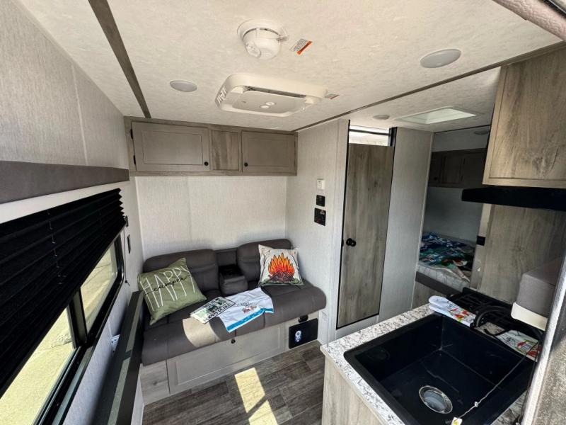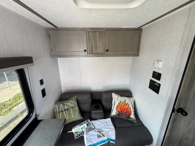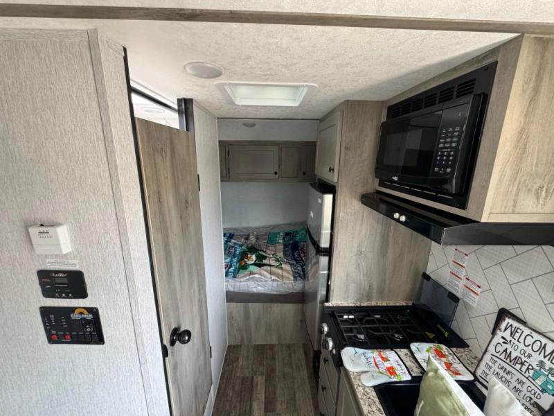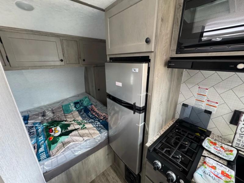 This compact travel trailer will be perfect for trips to the lake. Since there is a front bed, you won't have to sleep on an air mattress, and the convenient wet bath lets you freshen up each day. Breakfast can be made on two burner cooktop or in the microwave oven, and there is a refrigerator to keep your food fresh. This model also includes a sofa where you can relax in the evenings, and guests can sleep here if they want to tag along!