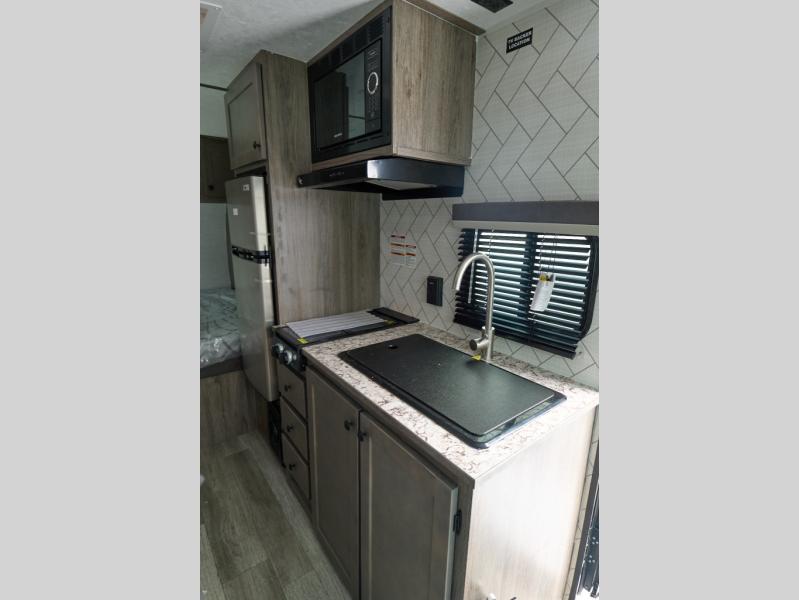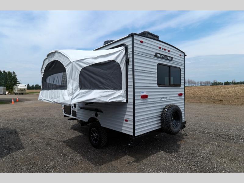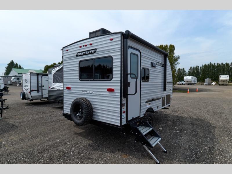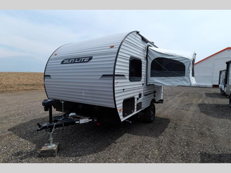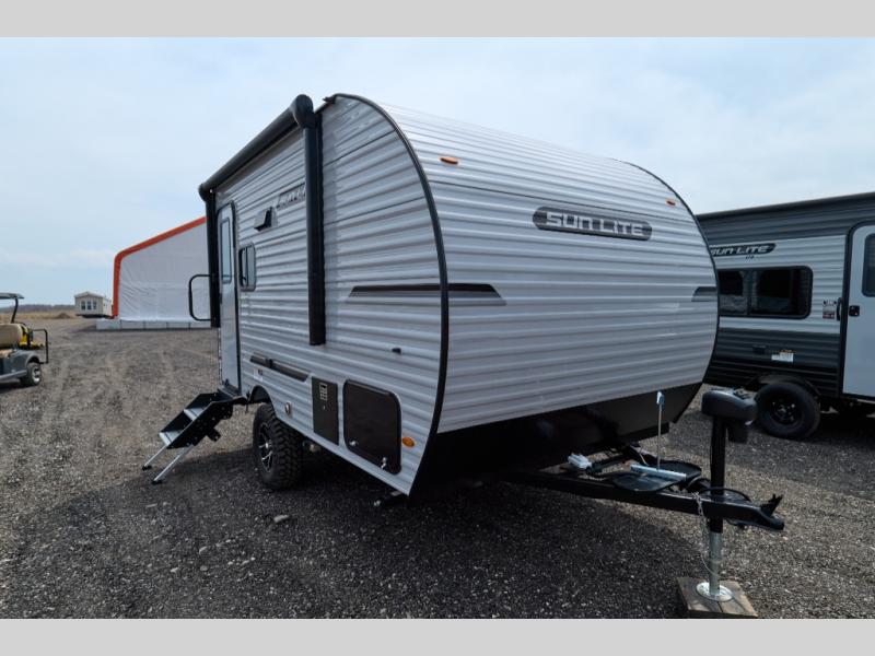 You can trust the build and enjoy your experience with any one of these Sunset Park RV Sun Lite travel trailers! Their aerodynamic profile is not only easy to haul, but also saves on fuel. They are built to withstand years of traveling even though they are lightweight with a diamond plate rock guard, a one piece PVC roof membrane, Dexter Spring-Leaf axles, and tinted safety glass windows. Some comfort standards you are sure to enjoy are the two-burner stove top range with hood, light and fan, plus the refrigerator and microwave, and an outside shower to help keep the dirt outdoors where it belongs.