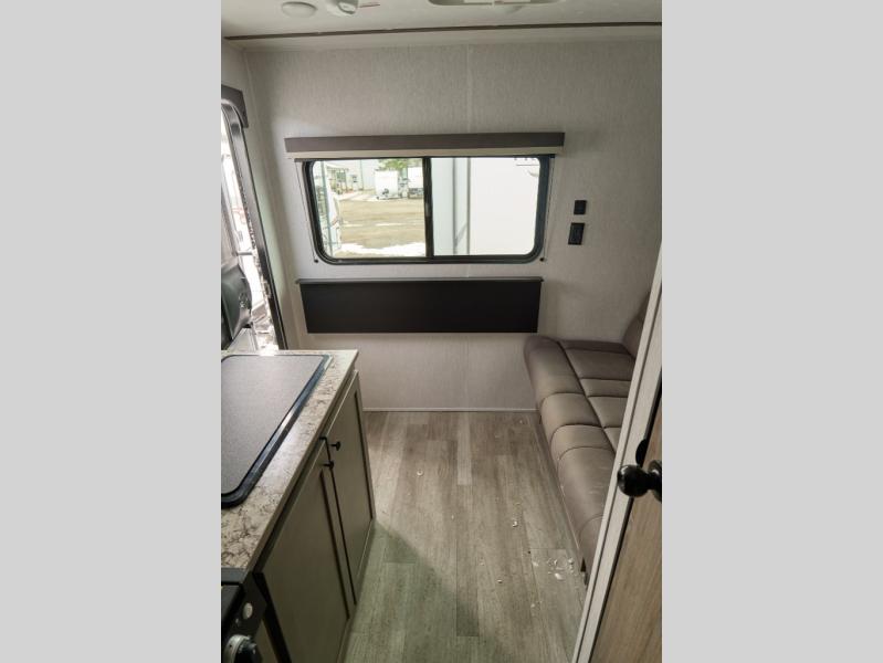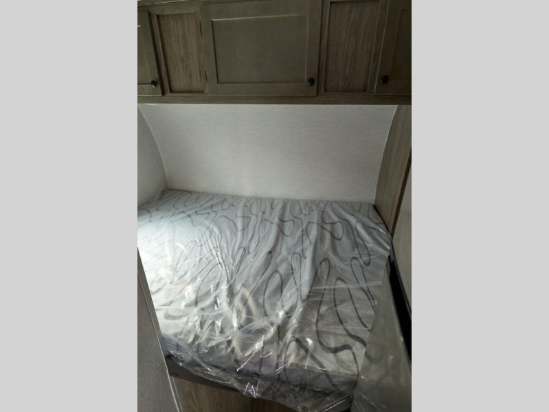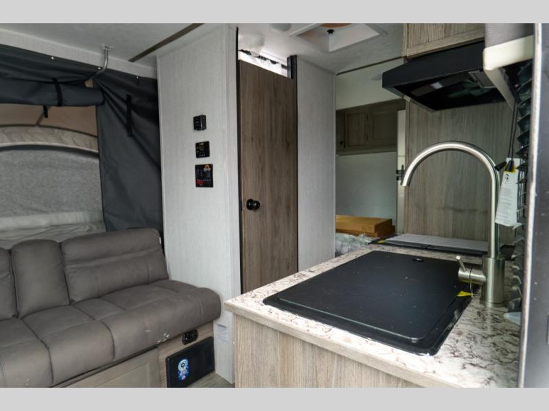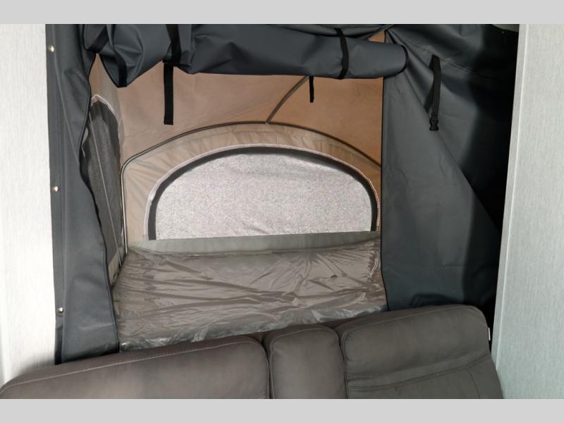 This compact travel trailer will be perfect for trips to the lake. Since there is a front bed, you won't have to sleep on an air mattress, and the convenient wet bath lets you freshen up each day. Breakfast can be made on two burner cooktop or in the microwave oven, and there is a refrigerator to keep your food fresh. This model also includes a sofa where you can relax in the evenings, and guests can sleep here if they want to tag along. And when the optional tent bed is added, you can sleep even more campers!