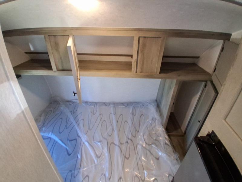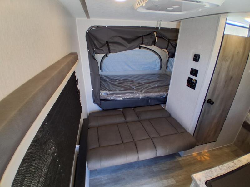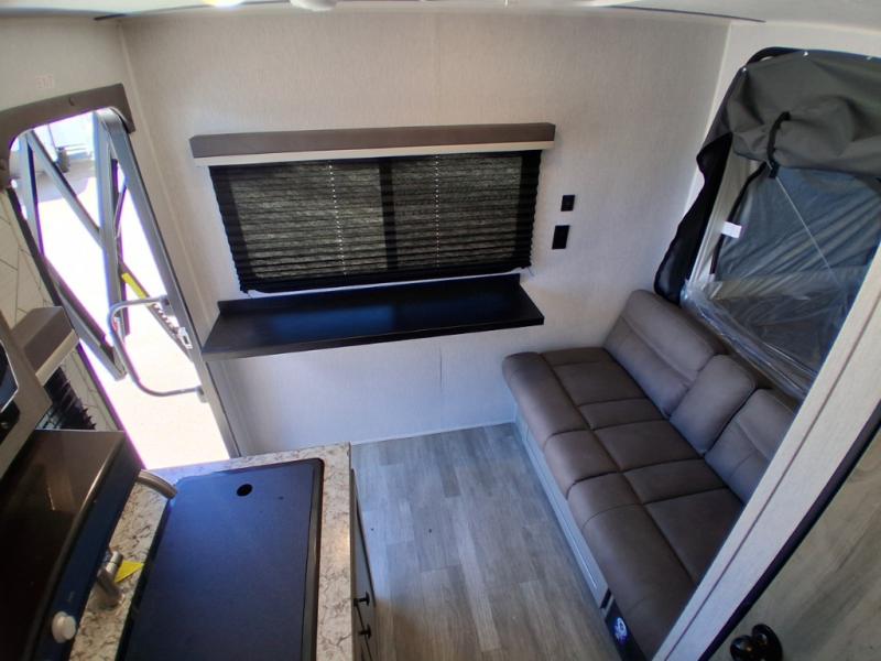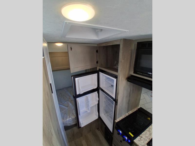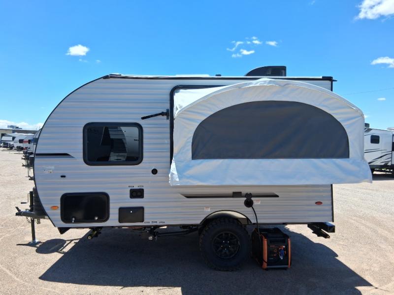 This compact travel trailer will be perfect for trips to the lake. Since there is a front bed, you won't have to sleep on an air mattress, and the convenient wet bath lets you freshen up each day. Breakfast can be made on two burner cooktop or in the microwave oven, and there is a refrigerator to keep your food fresh. This model also includes a sofa where you can relax in the evenings, and guests can sleep here if they want to tag along. And when the optional tent bed is added, you can sleep even more campers!