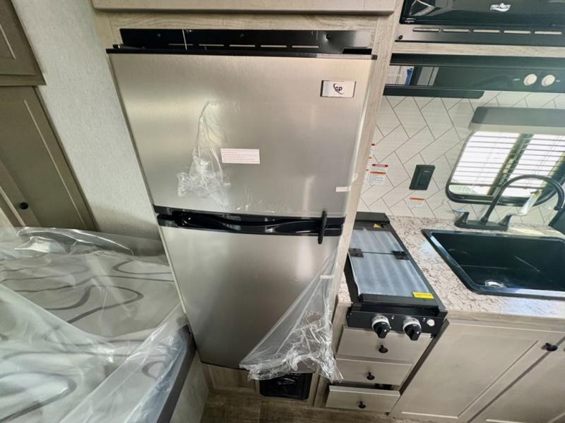 This compact travel trailer will be perfect for trips to the lake. Since there is a front bed, you won't have to sleep on an air mattress, and the convenient wet bath lets you freshen up each day. Breakfast can be made on two burner cooktop or in the microwave oven, and there is a refrigerator to keep your food fresh. This model also includes a sofa where you can relax in the evenings, and guests can sleep here if they want to tag along. And when the optional tent bed is added, you can sleep even more campers!