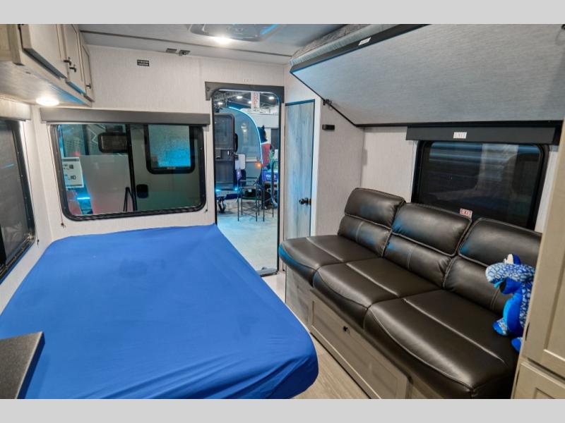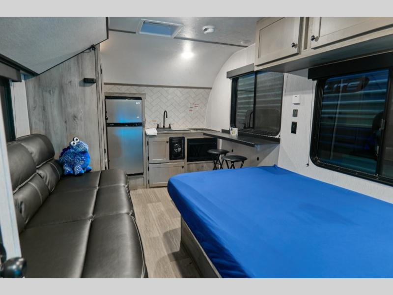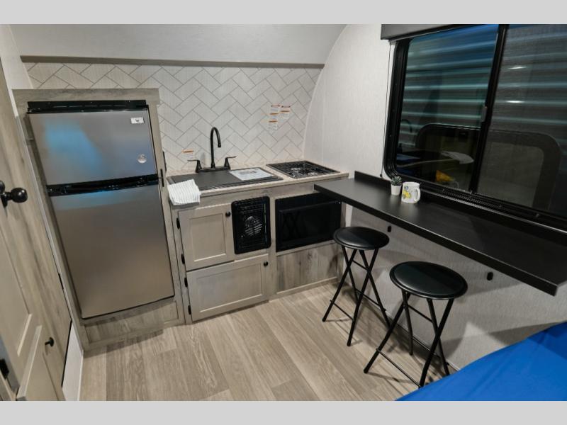 The innovative design of the Sunlite 15RBE provides an impressive amount of practical camping features that you won't find in other RVs of this size. Inside the Sunlite 15RBE, you'll find a full kitchen with a dinette bar, bathroom, couch, bunk bed, and loads of storage. Plus feel more connected with the outdoors with huge panoramic windows.