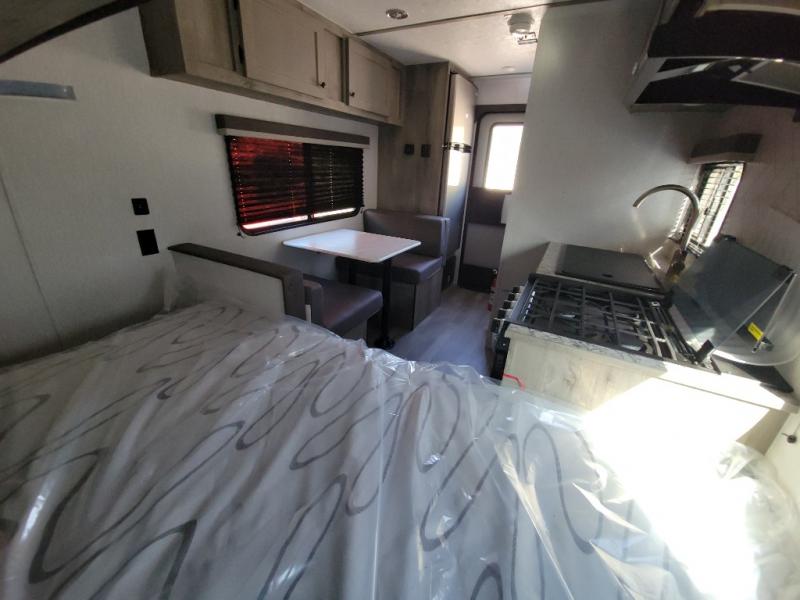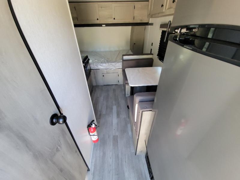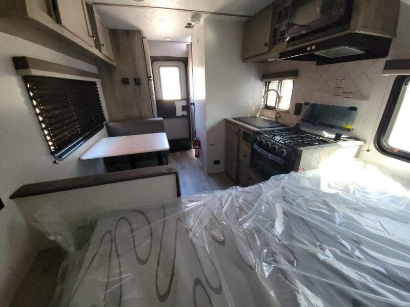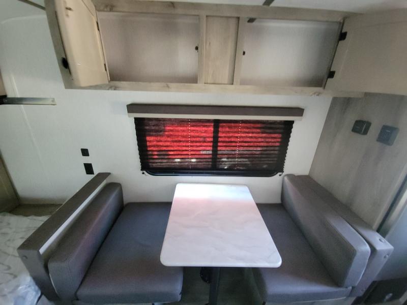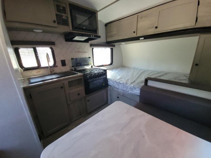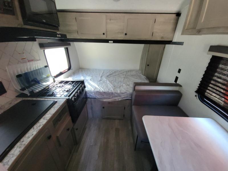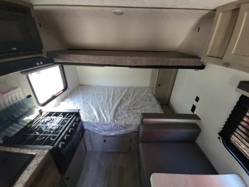 This travel trailer is perfect for couples who want to getaway together! The front bed offers a comfortable place to lay your head at night. When you're not using the booth dinette to enjoy a meal that you prepared with the two burner cooktop or playing a card game, you can transform it into an extra sleeping space. You can start your mornings feeling clean and fresh after showering in the tub with unwanted steam removed with the power roof vent.
