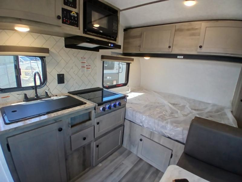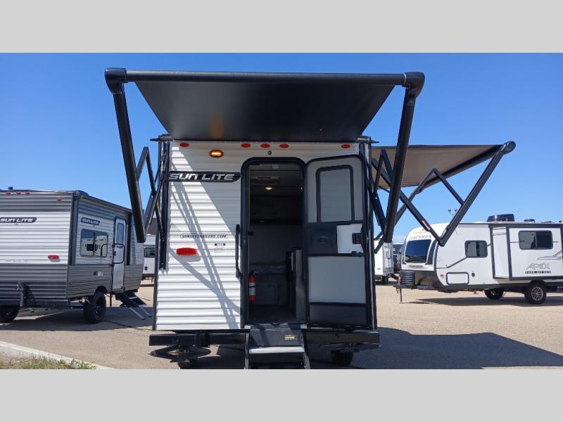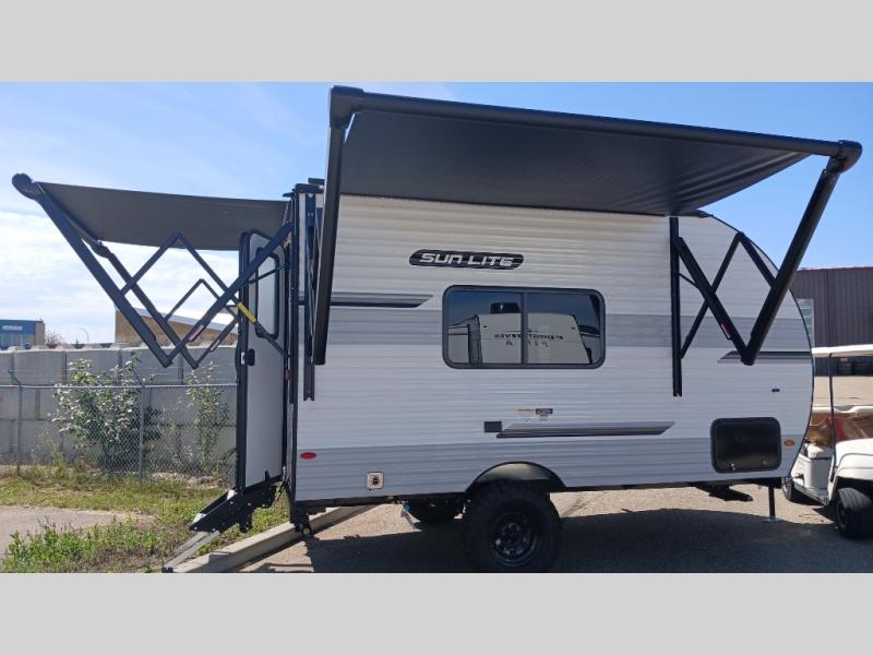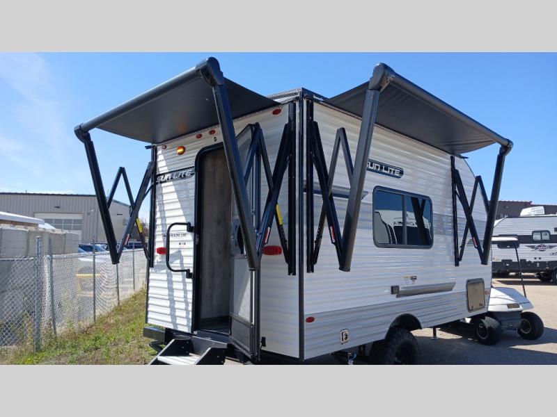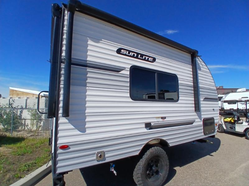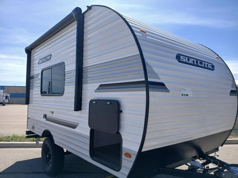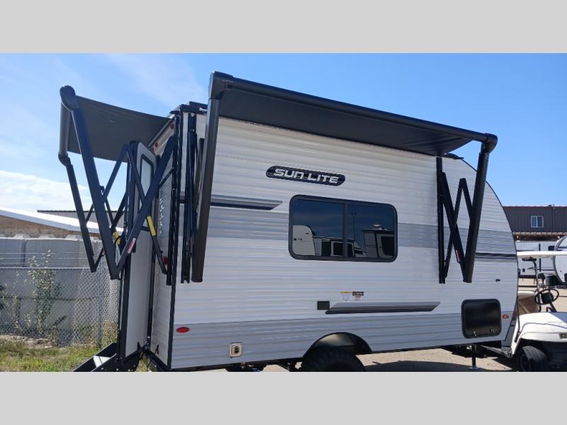 You can trust the build and enjoy your experience with any one of these Sunset Park RV Sun Lite travel trailers! Their aerodynamic profile is not only easy to haul, but also saves on fuel. They are built to withstand years of traveling even though they are lightweight with a diamond plate rock guard, a one piece PVC roof membrane, Dexter Spring-Leaf axles, and tinted safety glass windows. Some comfort standards you are sure to enjoy are the two-burner stove top range with hood, light and fan, plus the refrigerator and microwave, and an outside shower to help keep the dirt outdoors where it belongs.