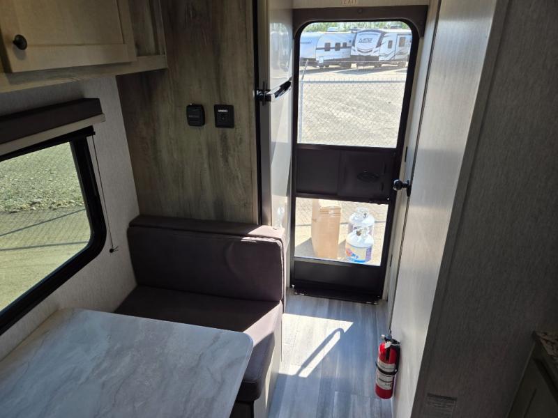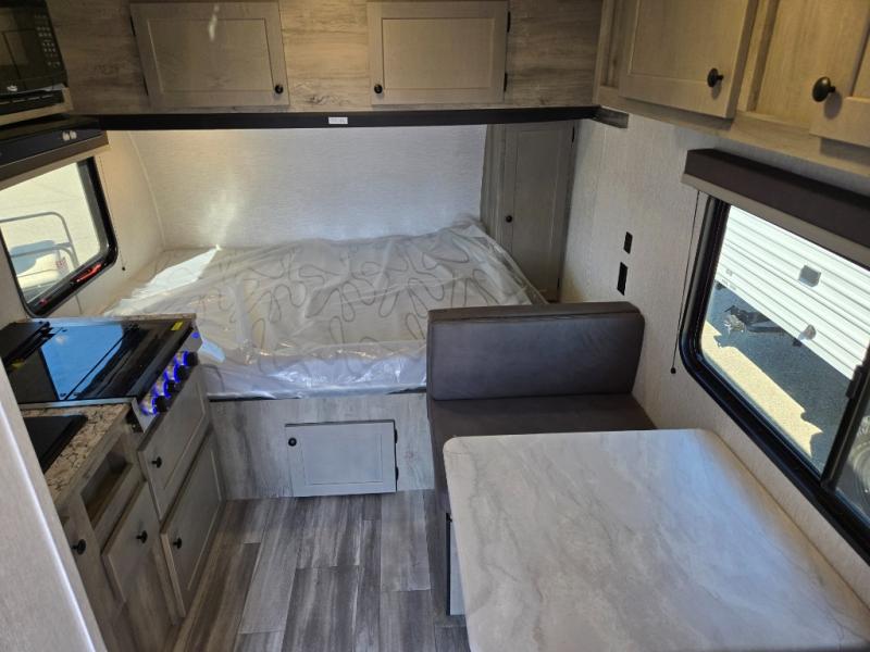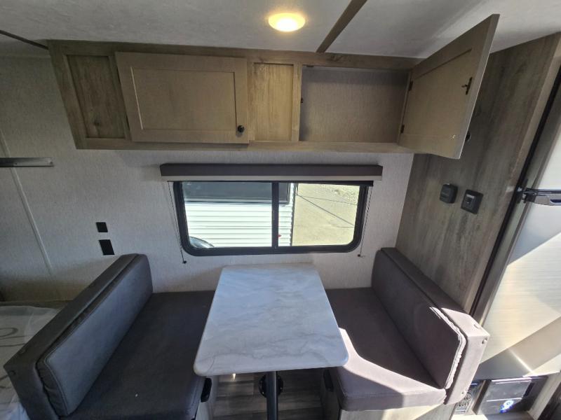 This travel trailer is perfect for couples who want to getaway together! The front bed offers a comfortable place to lay your head at night. When you're not using the booth dinette to enjoy a meal that you prepared with the two burner cooktop or playing a card game, you can transform it into an extra sleeping space. You can start your mornings feeling clean and fresh after showering in the tub with unwanted steam removed with the power roof vent.