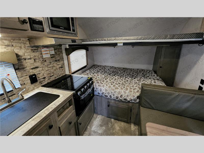 This travel trailer is perfect for couples who want to getaway together! The front bed offers a comfortable place to lay your head at night. When you're not using the booth dinette to enjoy a meal that you prepared with the two burner cooktop or playing a card game, you can transform it into an extra sleeping space. You can start your mornings feeling clean and fresh after showering in the tub with unwanted steam removed with the power roof vent.