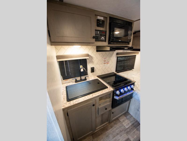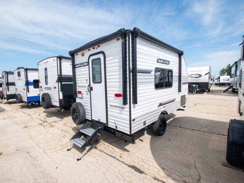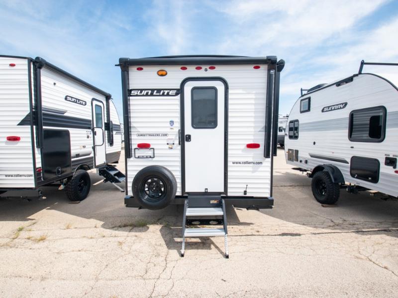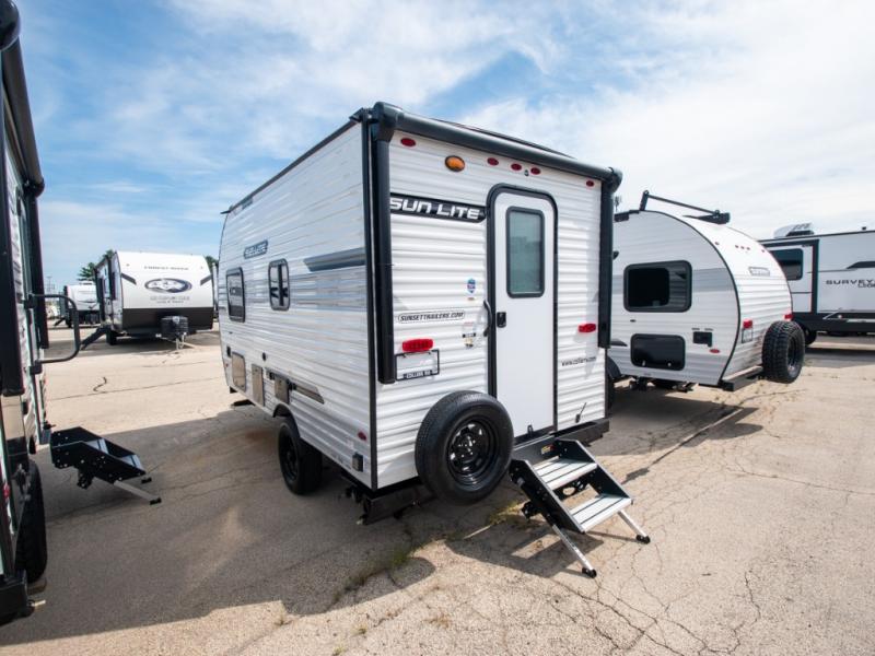 You can trust the build and enjoy your experience with any one of these Sunset Park RV Sun Lite travel trailers! Their aerodynamic profile is not only easy to haul, but also saves on fuel. They are built to withstand years of traveling even though they are lightweight with a diamond plate rock guard, a one piece PVC roof membrane, Dexter Spring-Leaf axles, and tinted safety glass windows. Some comfort standards you are sure to enjoy are the two-burner stove top range with hood, light and fan, plus the refrigerator and microwave, and an outside shower to help keep the dirt outdoors where it belongs.