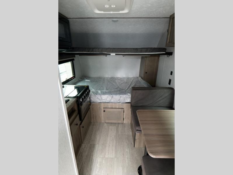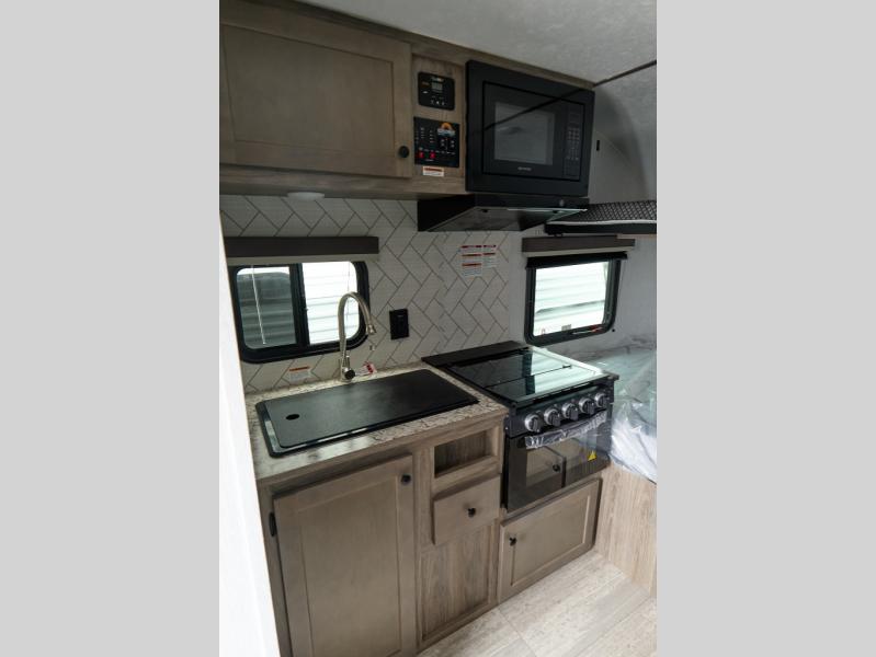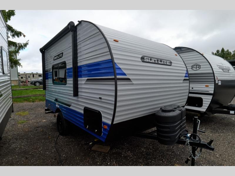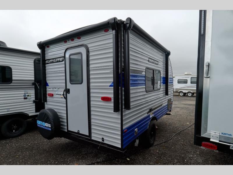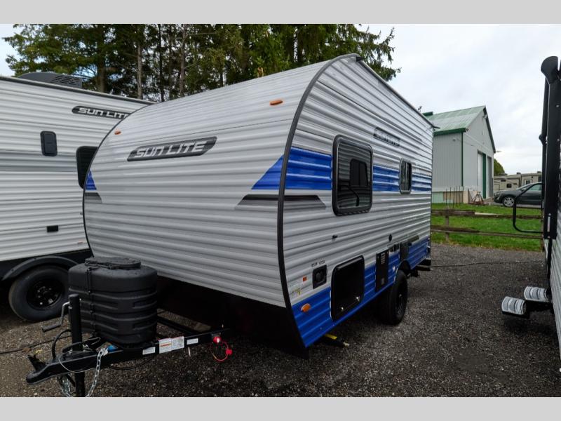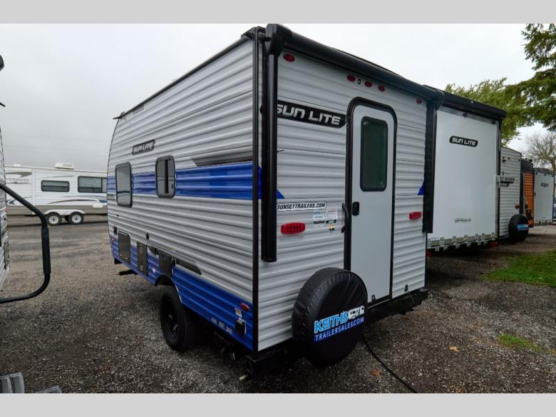 You can trust the build and enjoy your experience with any one of these Sunset Park RV Sun Lite travel trailers! Their aerodynamic profile is not only easy to haul, but also saves on fuel. They are built to withstand years of traveling even though they are lightweight with a diamond plate rock guard, a one piece PVC roof membrane, Dexter Spring-Leaf axles, and tinted safety glass windows. Some comfort standards you are sure to enjoy are the two-burner stove top range with hood, light and fan, plus the refrigerator and microwave, and an outside shower to help keep the dirt outdoors where it belongs.