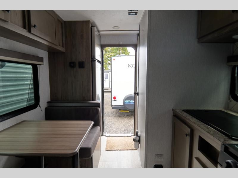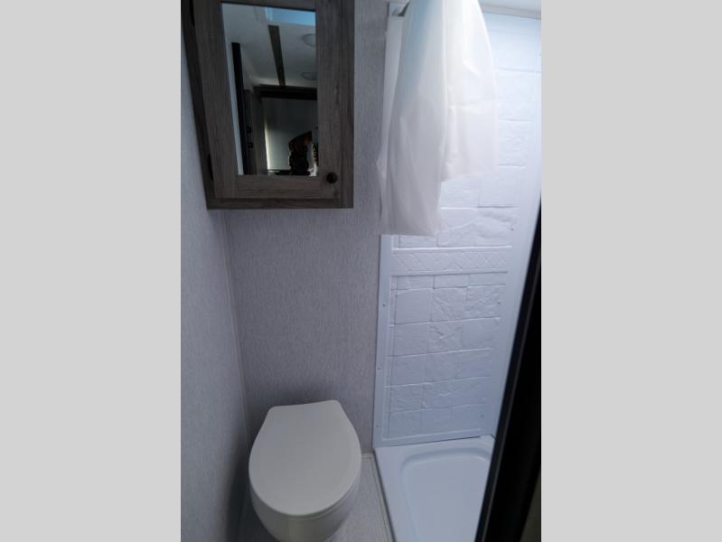 This travel trailer is perfect for couples who want to getaway together! The front bed offers a comfortable place to lay your head at night. When you're not using the booth dinette to enjoy a meal that you prepared with the two burner cooktop or playing a card game, you can transform it into an extra sleeping space. You can start your mornings feeling clean and fresh after showering in the tub with unwanted steam removed with the power roof vent.