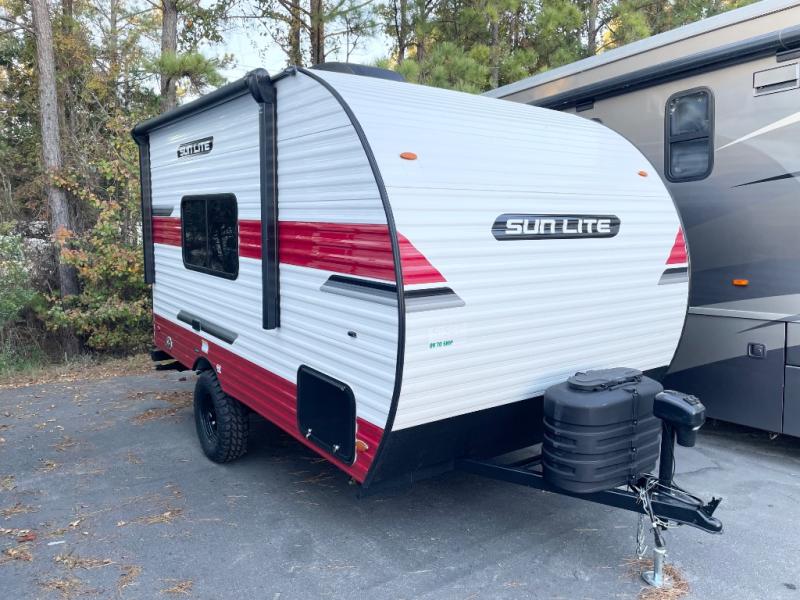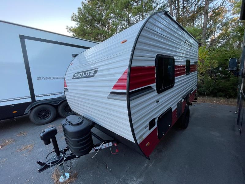 You can trust the build and enjoy your experience with any one of these Sunset Park RV Sun Lite travel trailers! Their aerodynamic profile is not only easy to haul, but also saves on fuel. They are built to withstand years of traveling even though they are lightweight with a diamond plate rock guard, a one piece PVC roof membrane, Dexter Spring-Leaf axles, and tinted safety glass windows. Some comfort standards you are sure to enjoy are the two-burner stove top range with hood, light and fan, plus the refrigerator and microwave, and an outside shower to help keep the dirt outdoors where it belongs.