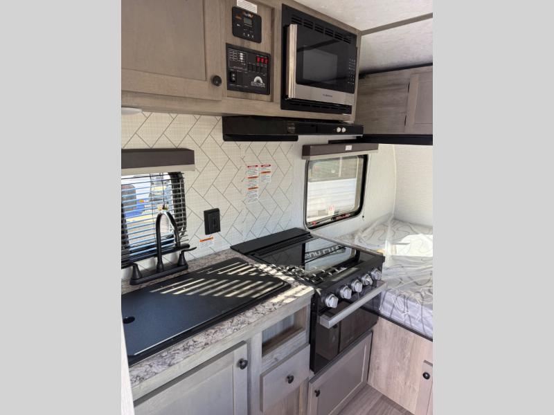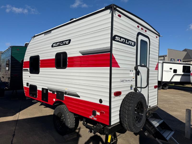 You can trust the build and enjoy your experience with any one of these Sunset Park RV Sun Lite travel trailers! Their aerodynamic profile is not only easy to haul, but also saves on fuel. They are built to withstand years of traveling even though they are lightweight with a diamond plate rock guard, a one piece PVC roof membrane, Dexter Spring-Leaf axles, and tinted safety glass windows. Some comfort standards you are sure to enjoy are the two-burner stove top range with hood, light and fan, plus the refrigerator and microwave, and an outside shower to help keep the dirt outdoors where it belongs.