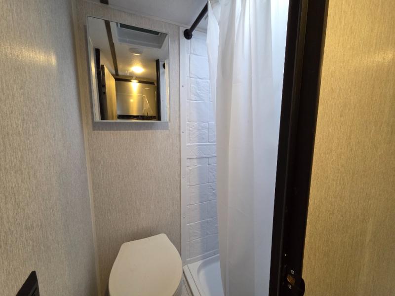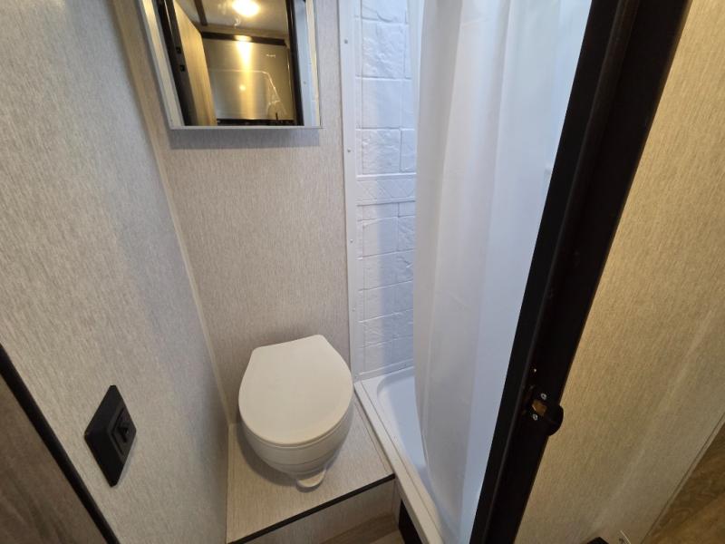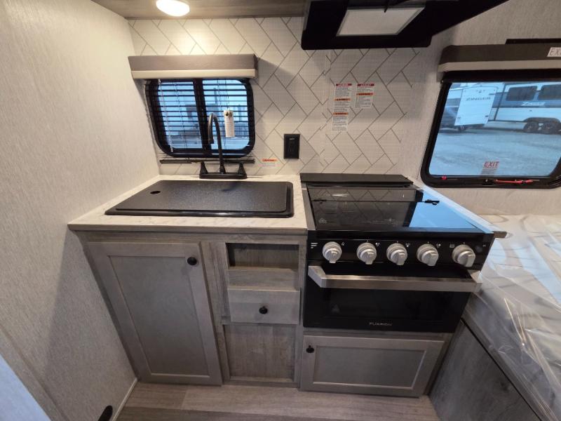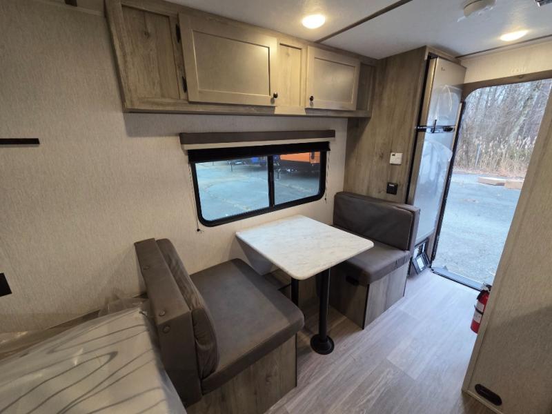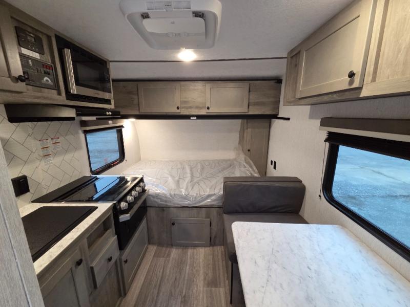 This travel trailer is perfect for couples who want to getaway together! The front bed offers a comfortable place to lay your head at night. When you're not using the booth dinette to enjoy a meal that you prepared with the two burner cooktop or playing a card game, you can transform it into an extra sleeping space. You can start your mornings feeling clean and fresh after showering in the tub with unwanted steam removed with the power roof vent.