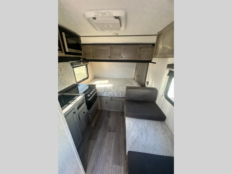 This travel trailer is perfect for couples who want to getaway together! The front bed offers a comfortable place to lay your head at night. When you're not using the booth dinette to enjoy a meal that you prepared with the two burner cooktop or playing a card game, you can transform it into an extra sleeping space. You can start your mornings feeling clean and fresh after showering in the tub with unwanted steam removed with the power roof vent.