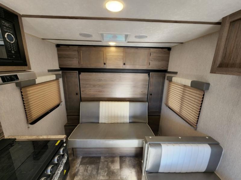Pack your bags and load up this travel trailer for a great camping trip! You will have everything you need to keep your belly full with the two burner cooktop, your hair clean with a tub inside rear corner bathroom which also has a power vent fan, and your body well rested after sleeping on the front bed. You can even play card games at the booth dinette or transform it into an extra sleeping space. There is also an outside shower to rinse the mud off your feet before entering inside!