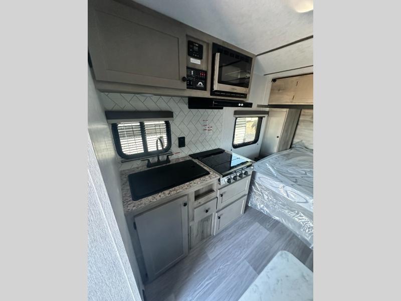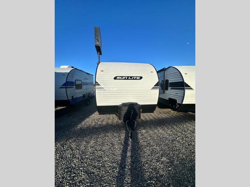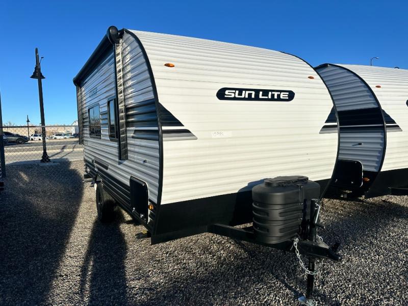 You can trust the build and enjoy your experience with any one of these Sunset Park RV Sun Lite travel trailers! Their aerodynamic profile is not only easy to haul, but also saves on fuel. They are built to withstand years of traveling even though they are lightweight with a diamond plate rock guard, a one piece PVC roof membrane, Dexter Spring-Leaf axles, and tinted safety glass windows. Some comfort standards you are sure to enjoy are the two-burner stove top range with hood, light and fan, plus the refrigerator and microwave, and an outside shower to help keep the dirt outdoors where it belongs.